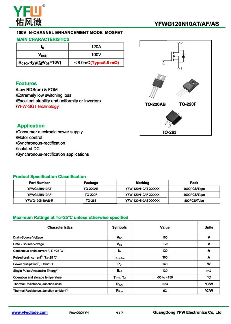 場效應管YFWG120N10AS-R 規格書_價格_PDF手冊-廣東佑風微原廠YFWG120N10AS-R TO-263_(YFW佑風微)品牌