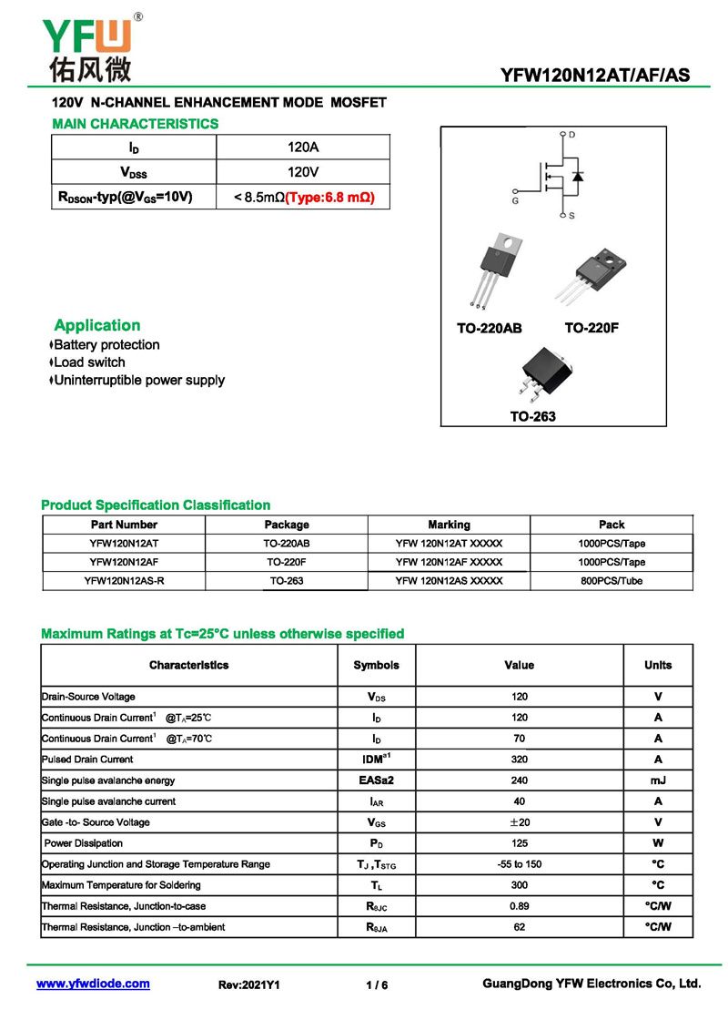 場效應管YFW120N12AS-R 規格書_價格_PDF手冊-廣東佑風微原廠YFW120N12AS-R TO-263_(YFW佑風微)品牌