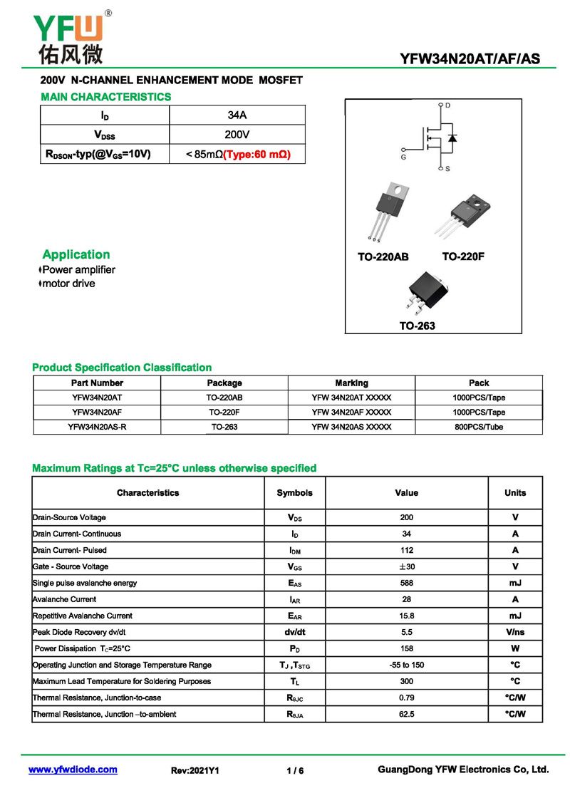 場效應管YFW34N20AS-R 規格書_價格_PDF手冊-廣東佑風微原廠YFW34N20AS-R TO-263_(YFW佑風微)品牌