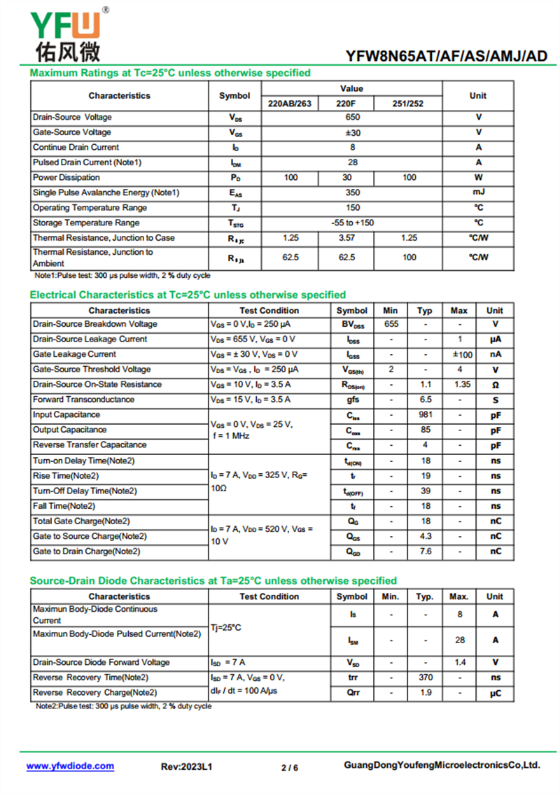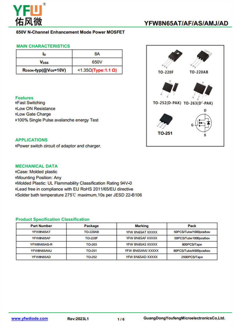 場效應管YFW8N65AS-R 規格書_價格_PDF手冊-廣東佑風微原廠YFW8N65AS-R TO-263_(YFW佑風微)品牌