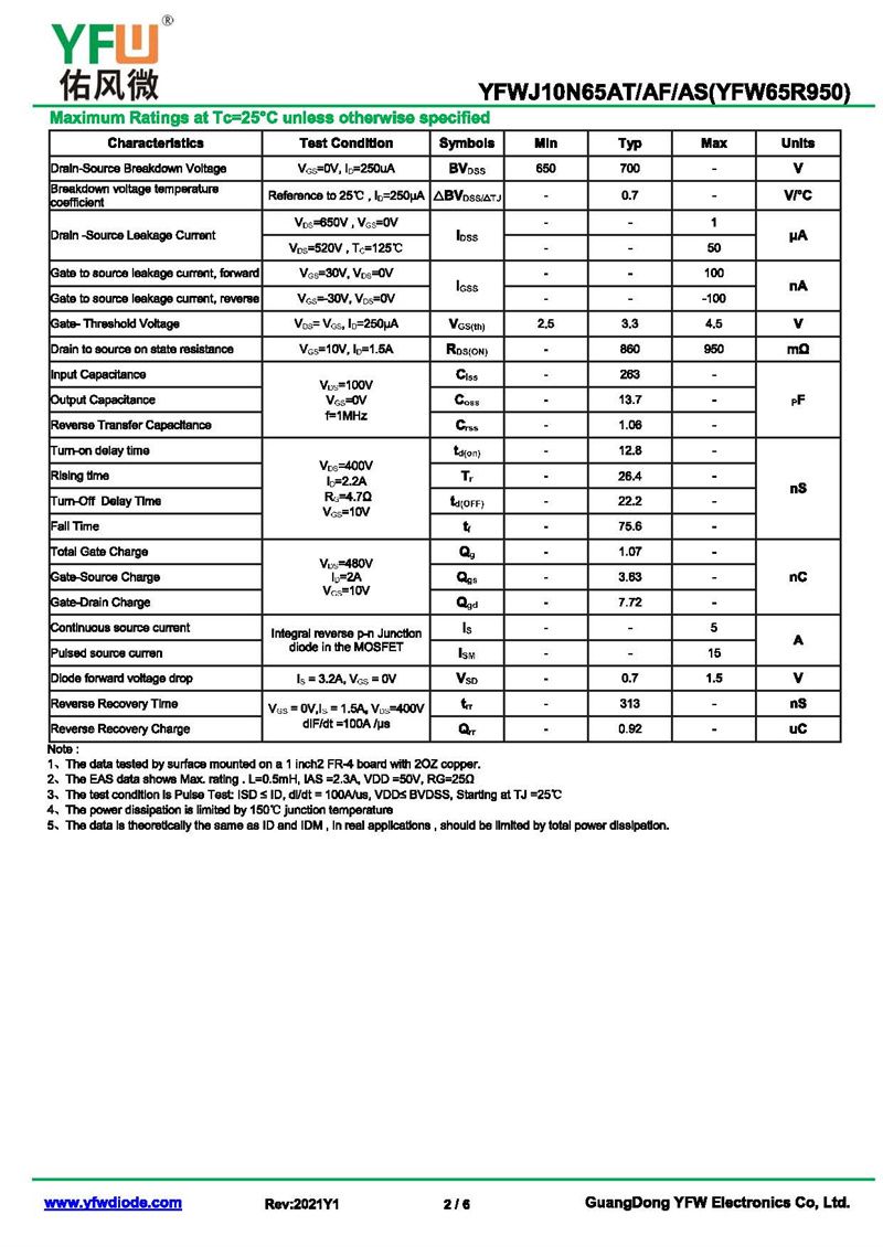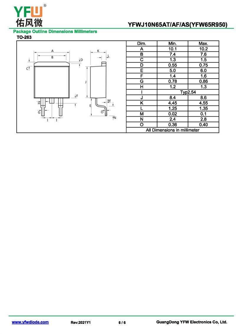 場效應管YFWJ10N65AS-R 規格書_價格_PDF手冊-廣東佑風微原廠YFWJ10N65AS-R TO-263_(YFW佑風微)品牌