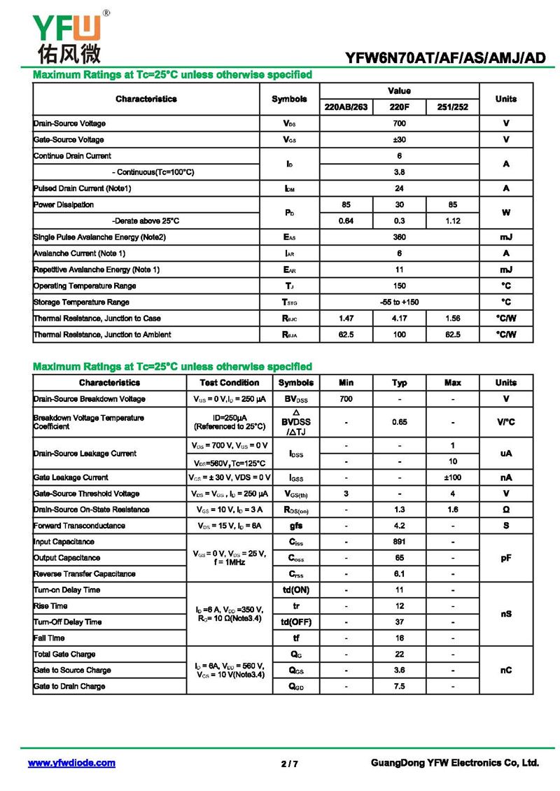 場效應(yīng)管YFW6N70AS-R 規(guī)格書_價(jià)格_PDF手冊(cè)-廣東佑風(fēng)微原廠YFW6N70AS-R TO-263_(YFW佑風(fēng)微)品牌