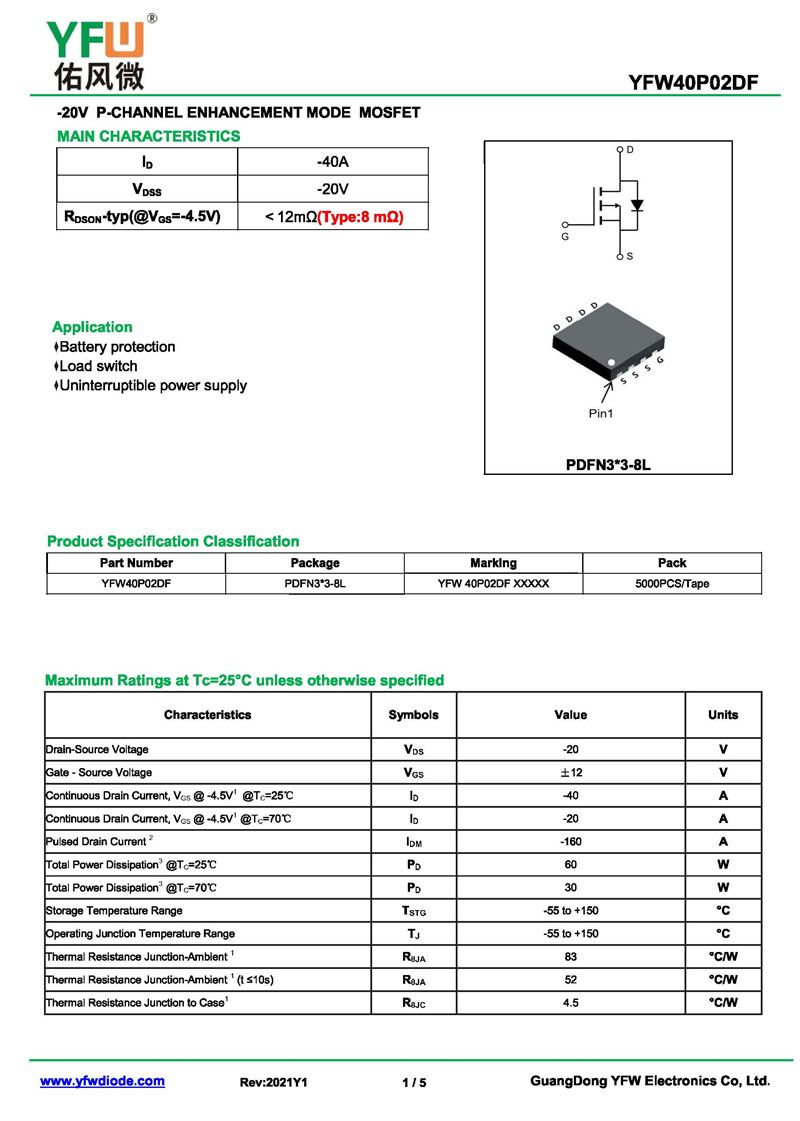 場效應管YFW40P02DF 規(guī)格書_價格_PDF手冊-廣東佑風微原廠YFW40P02DF PDFN3*3-8L_(YFW佑風微)品牌