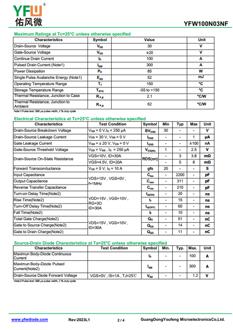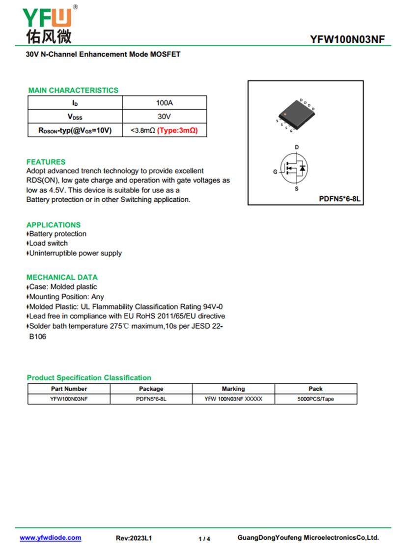 場效應管YFW100N03NF 規格書_價格_PDF手冊-廣東佑風微原廠YFW100N03NF PDFN5*6-8L_(YFW佑風微)品牌