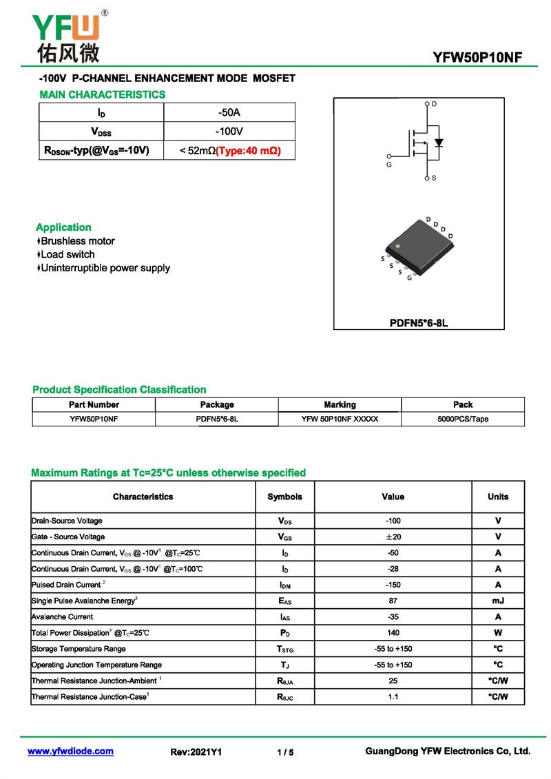 場效應管YFW50P10NF 規格書_價格_PDF手冊-廣東佑風微原廠YFW50P10NF PDFN5*6-8L_(YFW佑風微)品牌