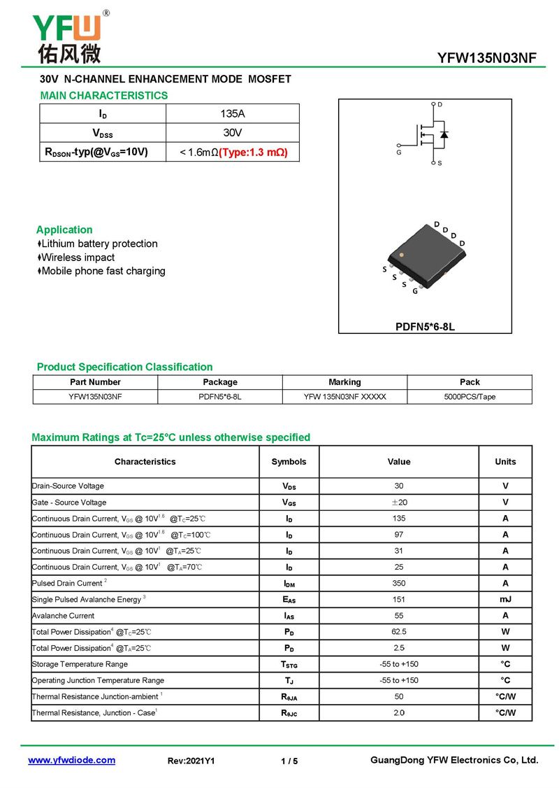 場效應管YFW135N03NF 規格書_價格_PDF手冊-廣東佑風微原廠YFW135N03NF PDFN5*6-8L_(YFW佑風微)品牌