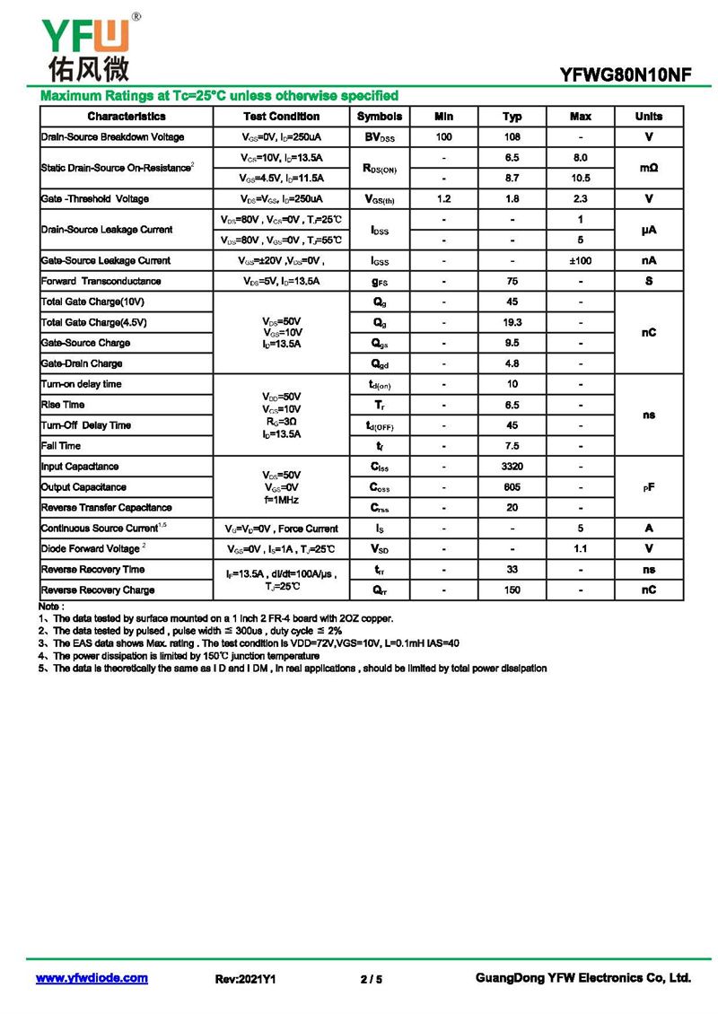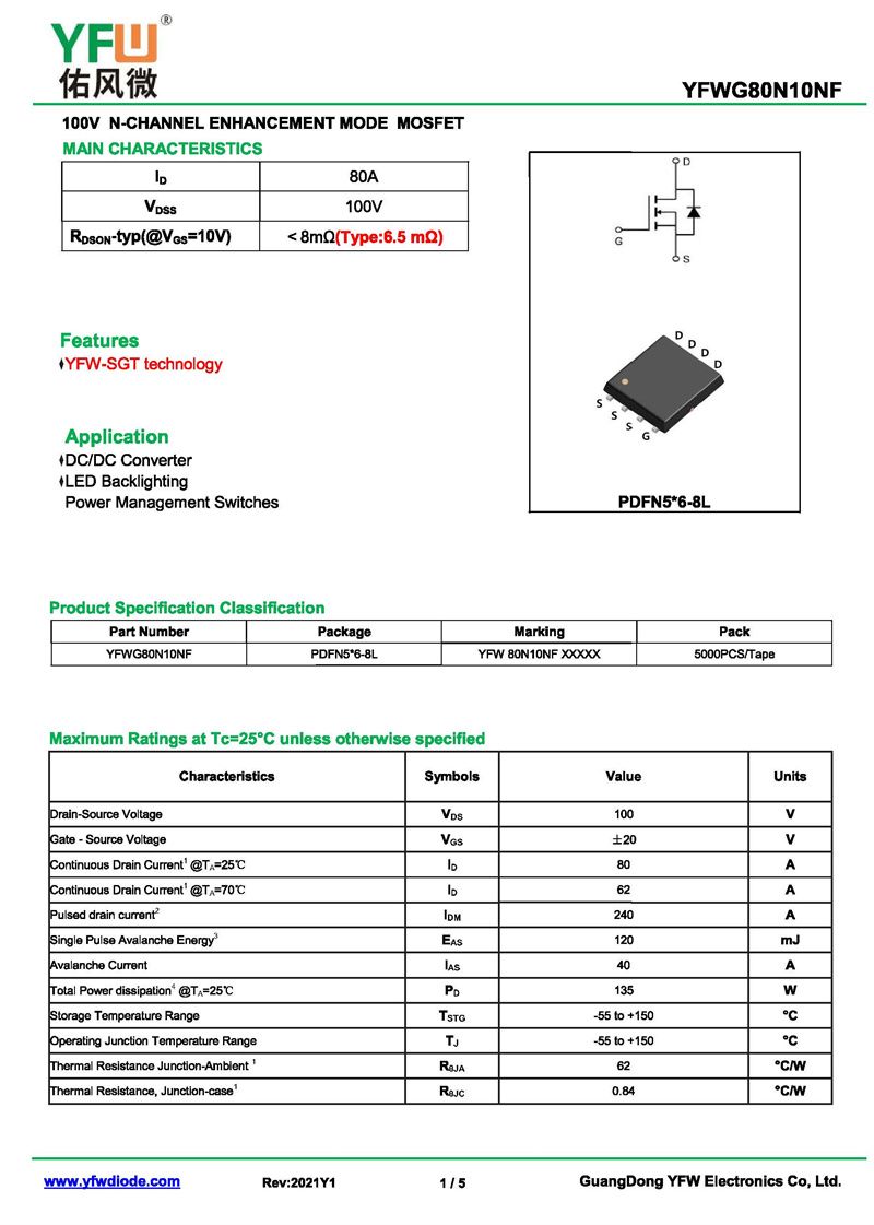 場效應管YFWG80N10NF 規格書_價格_PDF手冊-廣東佑風微原廠YFWG80N10NF PDFN5*6-8L_(YFW佑風微)品牌