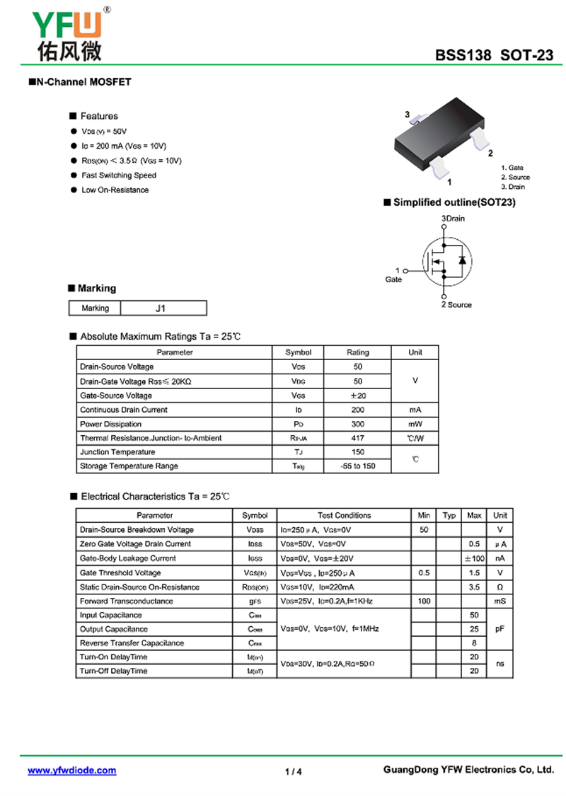 場效應管BSS138 規格書_價格_PDF手冊-廣東佑風微原廠BSS138 SOT-23 _(YFW佑風微)品牌