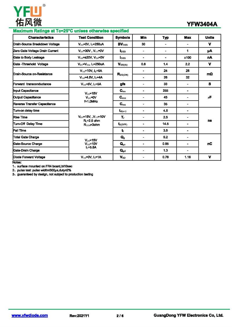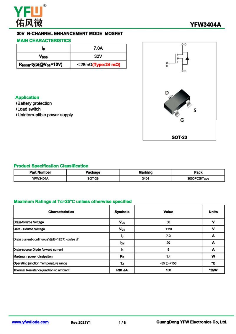 場效應管YFW3404 規格書_價格_PDF手冊-廣東佑風微原廠YFW3404 SOT-23 _(YFW佑風微)品牌