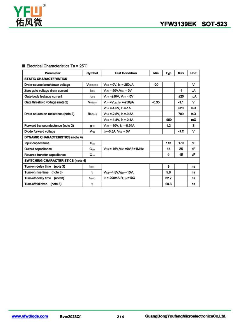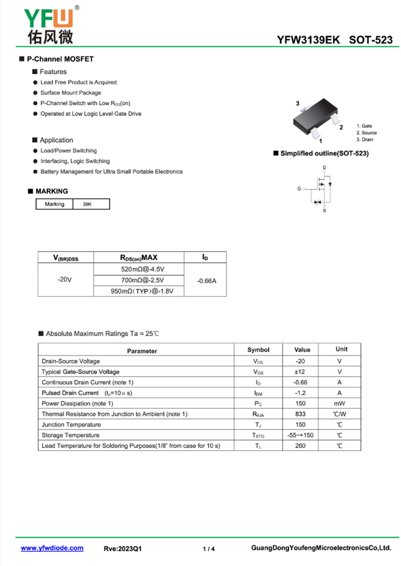 場效應管YFW3139EK 規格書_價格_PDF手冊-廣東佑風微原廠YFW3139EK SOT-723 _(YFW佑風微)品牌