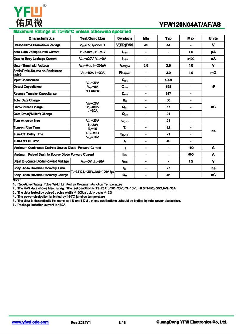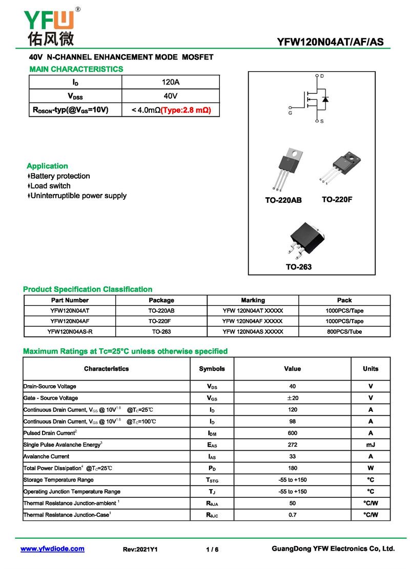 場效應管YFW120N04AT 規格書_價格_PDF手冊-廣東佑風微原廠YFW120N04AT TO-220AB _(YFW佑風微)品牌