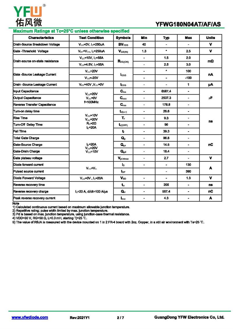 場效應管YFWG180N04AF 規格書_價格_PDF手冊-廣東佑風微原廠YFWG180N04AF TO-220F _(YFW佑風微)品牌