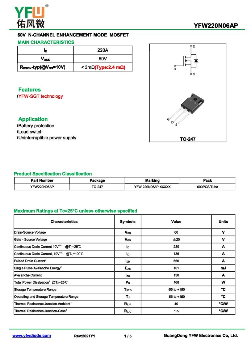 場效應管YFW220N06AP 規格書_價格_PDF手冊-廣東佑風微原廠YFW220N06AP TO-247_(YFW佑風微)品牌