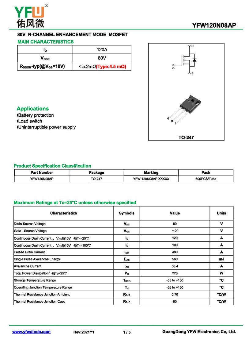 場效應管YFW120N08AP 規格書_價格_PDF手冊-廣東佑風微原廠YFW120N08AP TO-247_(YFW佑風微)品牌