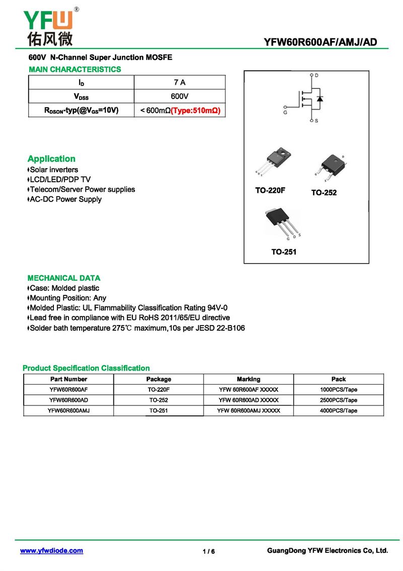 場效應管YFW60R600AMJ 規格書_價格_PDF手冊-廣東佑風微原廠YFW60R600AMJ TO-251_(YFW佑風微)品牌