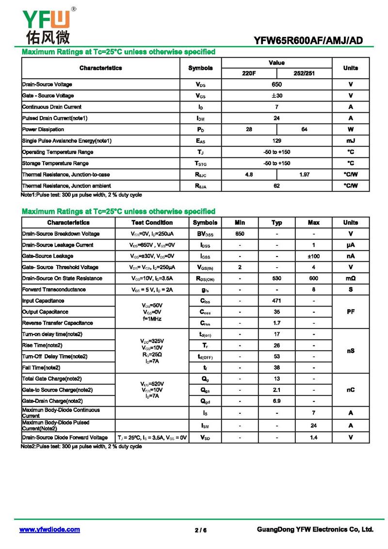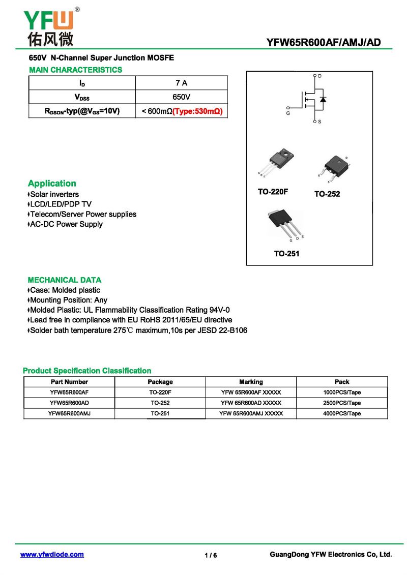 場效應管YFW65R600AMJ 規格書_價格_PDF手冊-廣東佑風微原廠YFW65R600AMJ TO-251_(YFW佑風微)品牌