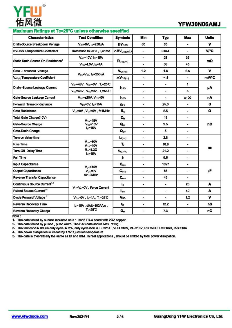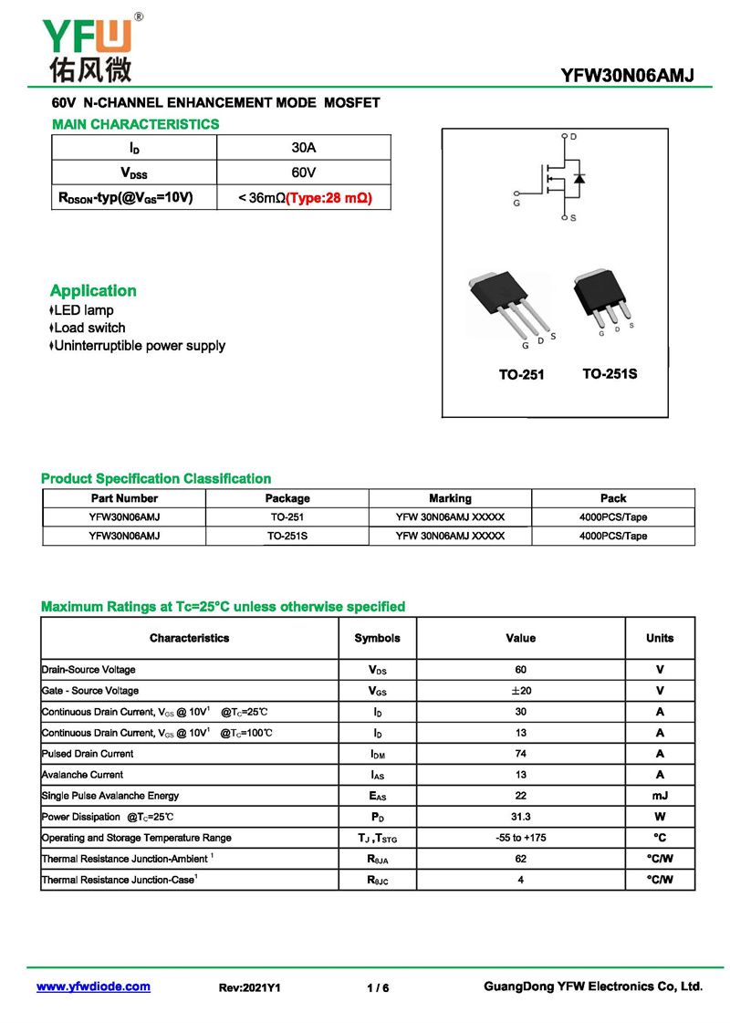 場效應管YFW30N06AMJ 規格書_價格_PDF手冊-廣東佑風微原廠YFW30N06AMJ TO-251_(YFW佑風微)品牌