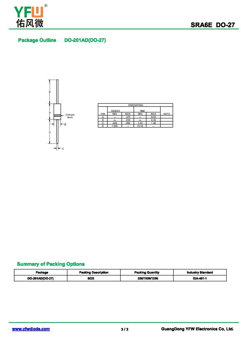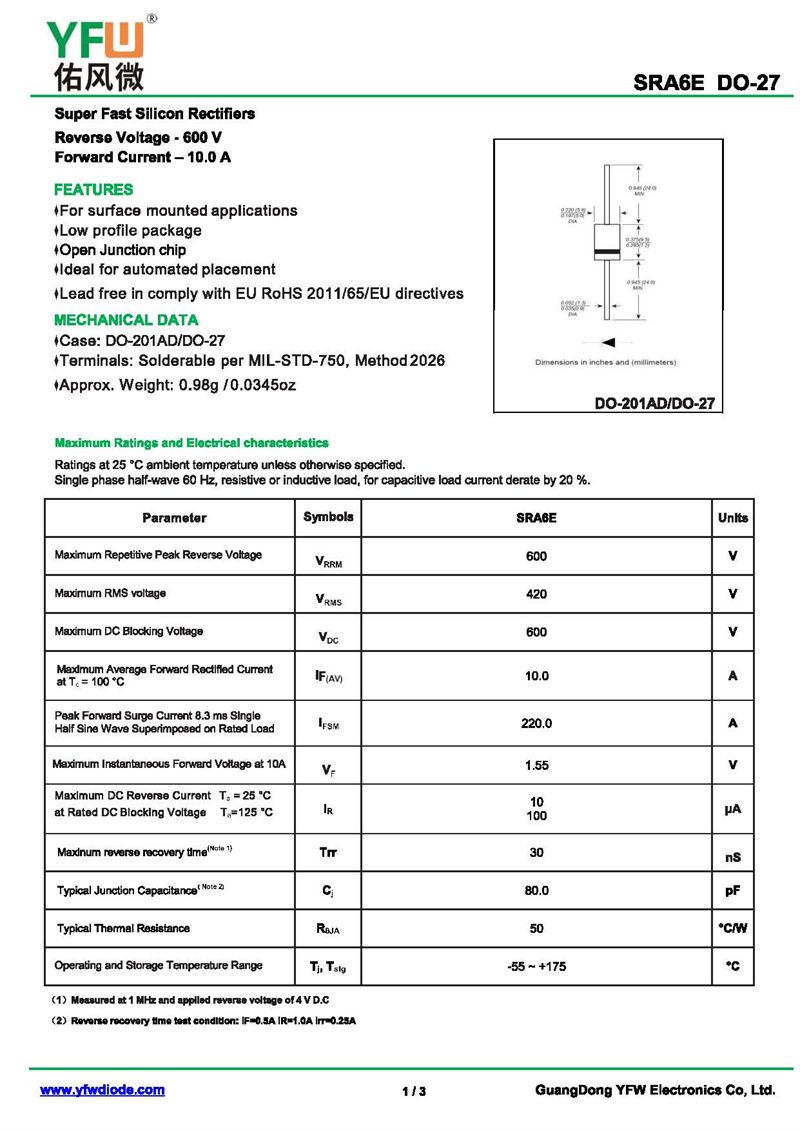超快恢復二極管SRA6E 規(guī)格書_價格_PDF手冊-廣東佑風微原廠SRA6E DO-27_(YFW佑風微)品牌