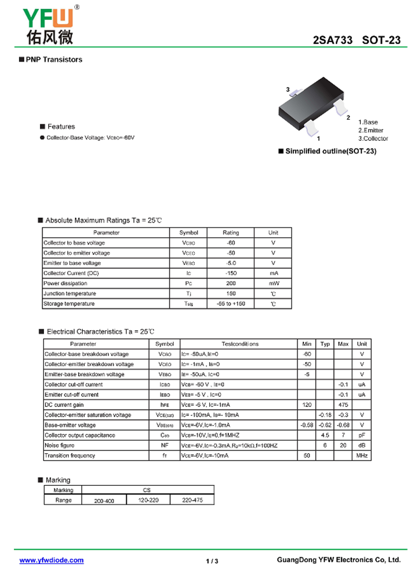 晶體管2SA733 規格書_價格_PDF手冊-廣東佑風微原廠2SA733 SOT-23_(YFW佑風微)品牌