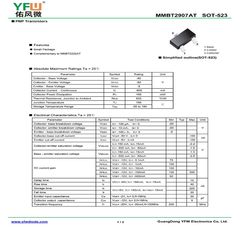 晶體管MMBT2907AT 規格書_價格_PDF手冊-廣東佑風微原廠MMBT2907AT SOT-523_(YFW佑風微)品牌