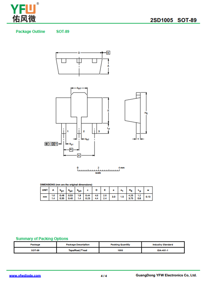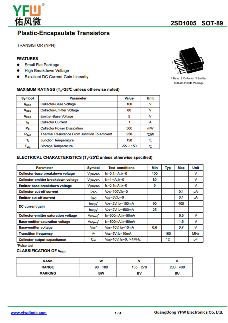 晶體管2SD1005 規格書_價格_PDF手冊-廣東佑風微原廠2SD1005 SOT-89_(YFW佑風微)品牌