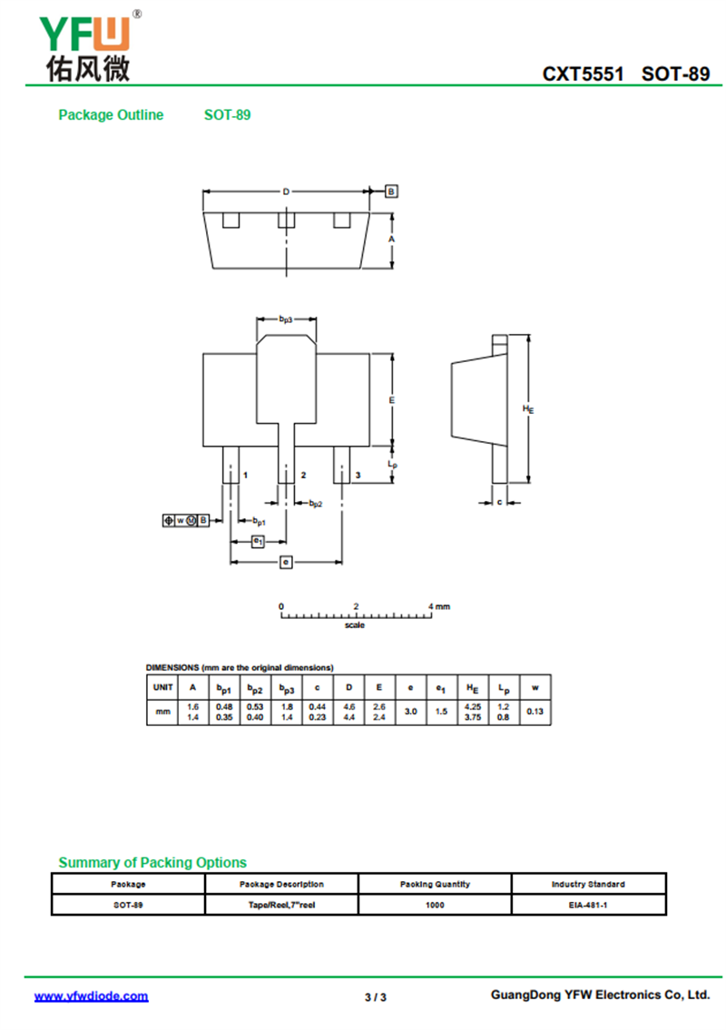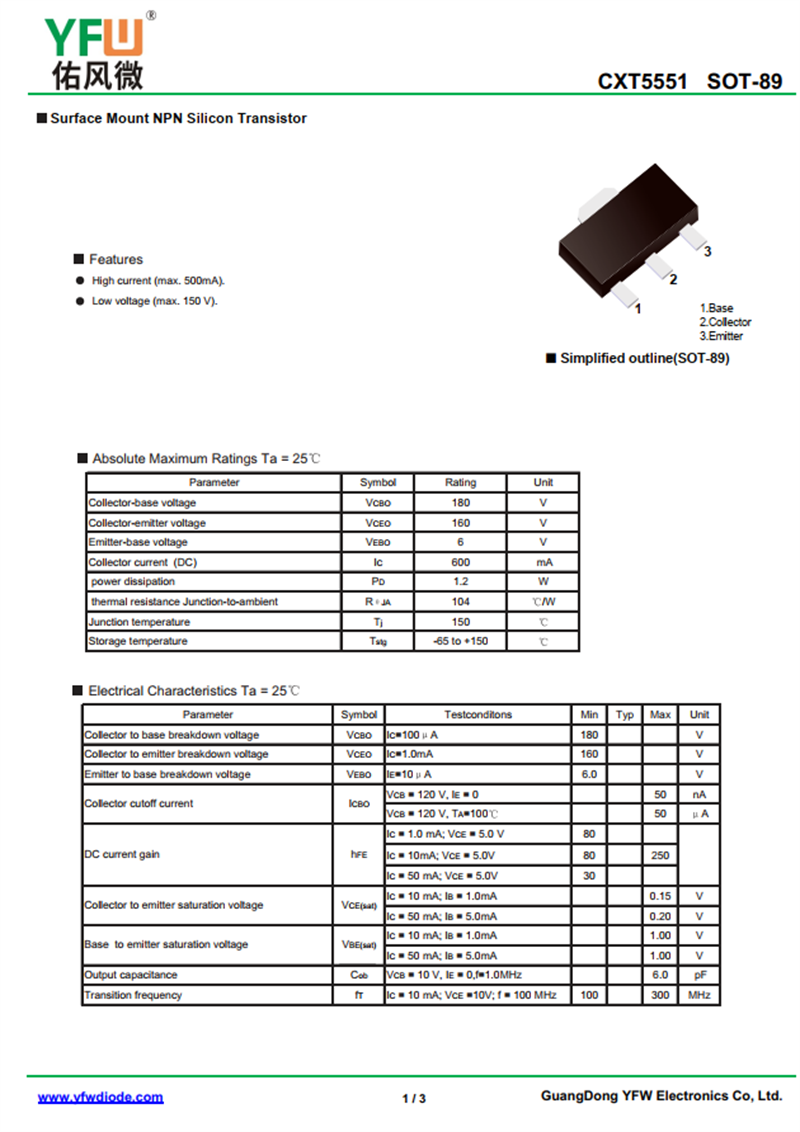 晶體管CXT5551 規格書_價格_PDF手冊-廣東佑風微原廠CXT5551 SOT-89_(YFW佑風微)品牌