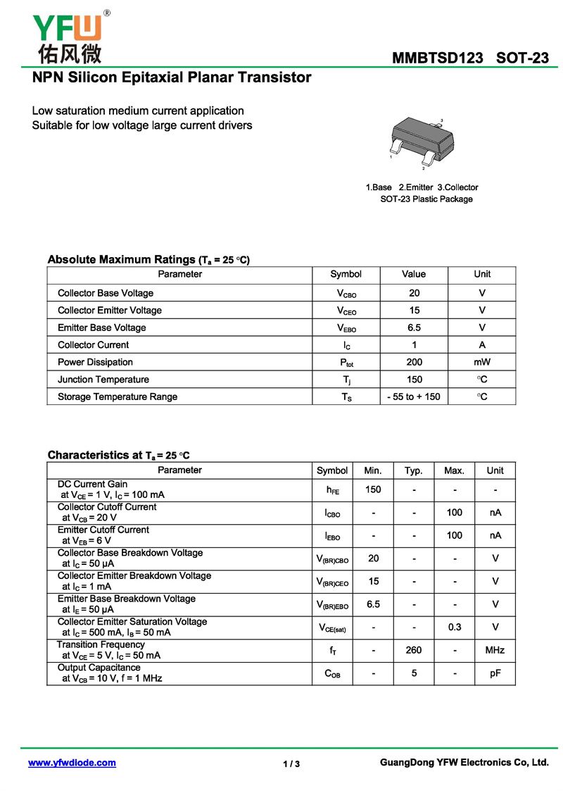 晶體管MMBTSD123 規格書_價格_PDF手冊-廣東佑風微原廠MMBTSD123SOT-23_(YFW佑風微)品牌