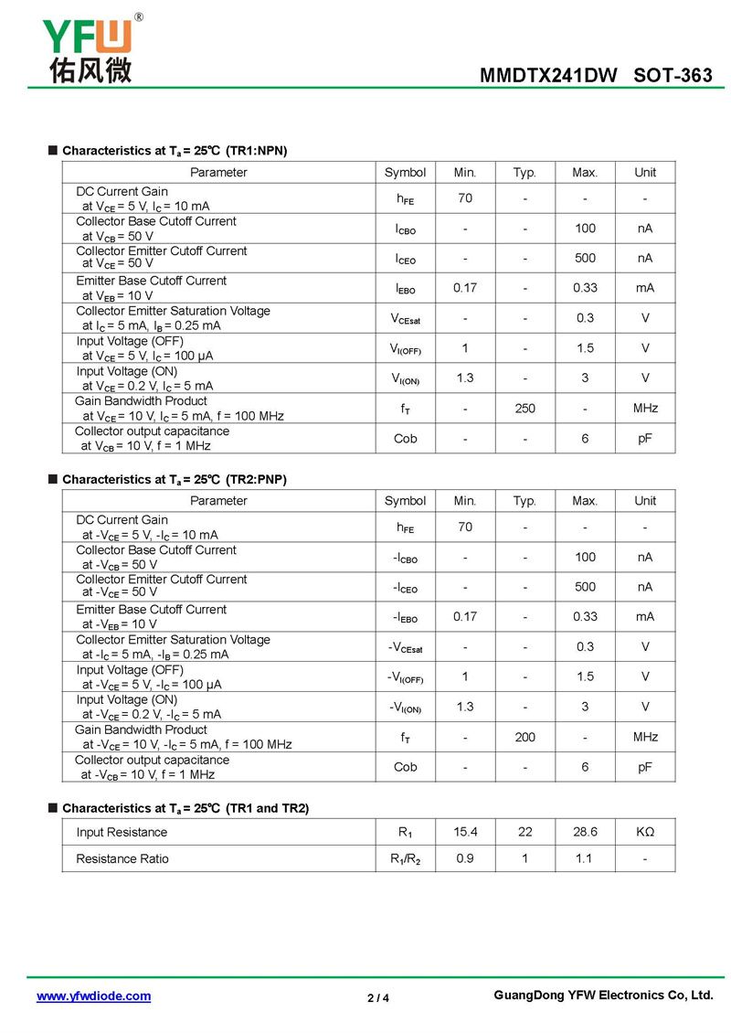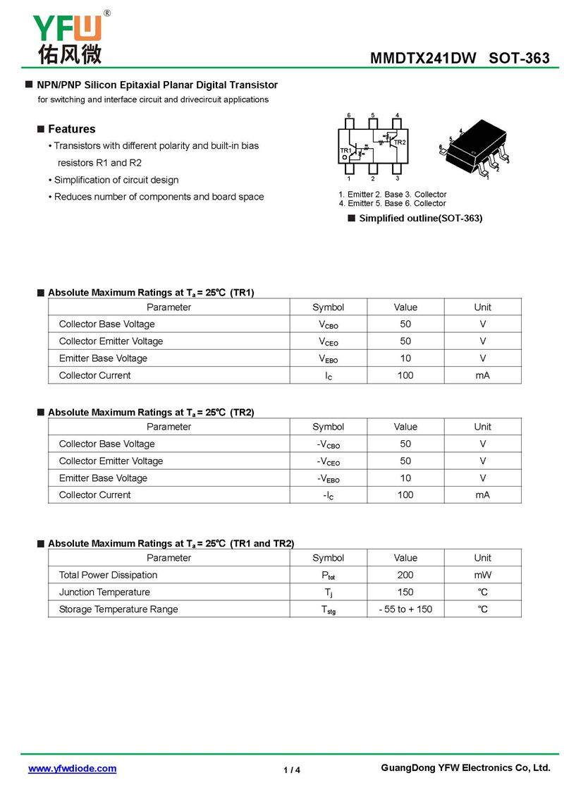 晶體管MMDTX241DW 規格書_價格_PDF手冊-廣東佑風微原廠MMDTX241DW SOT-363_(YFW佑風微)品牌