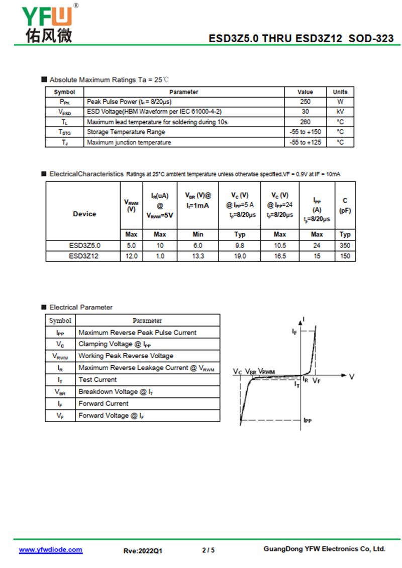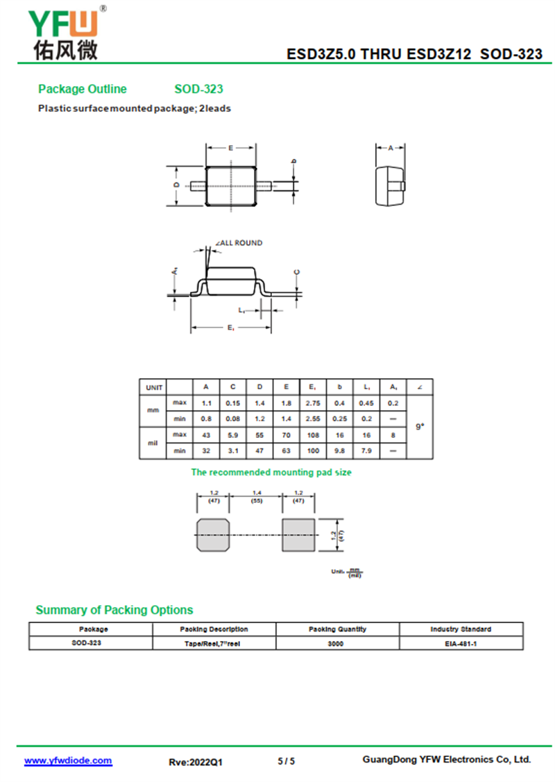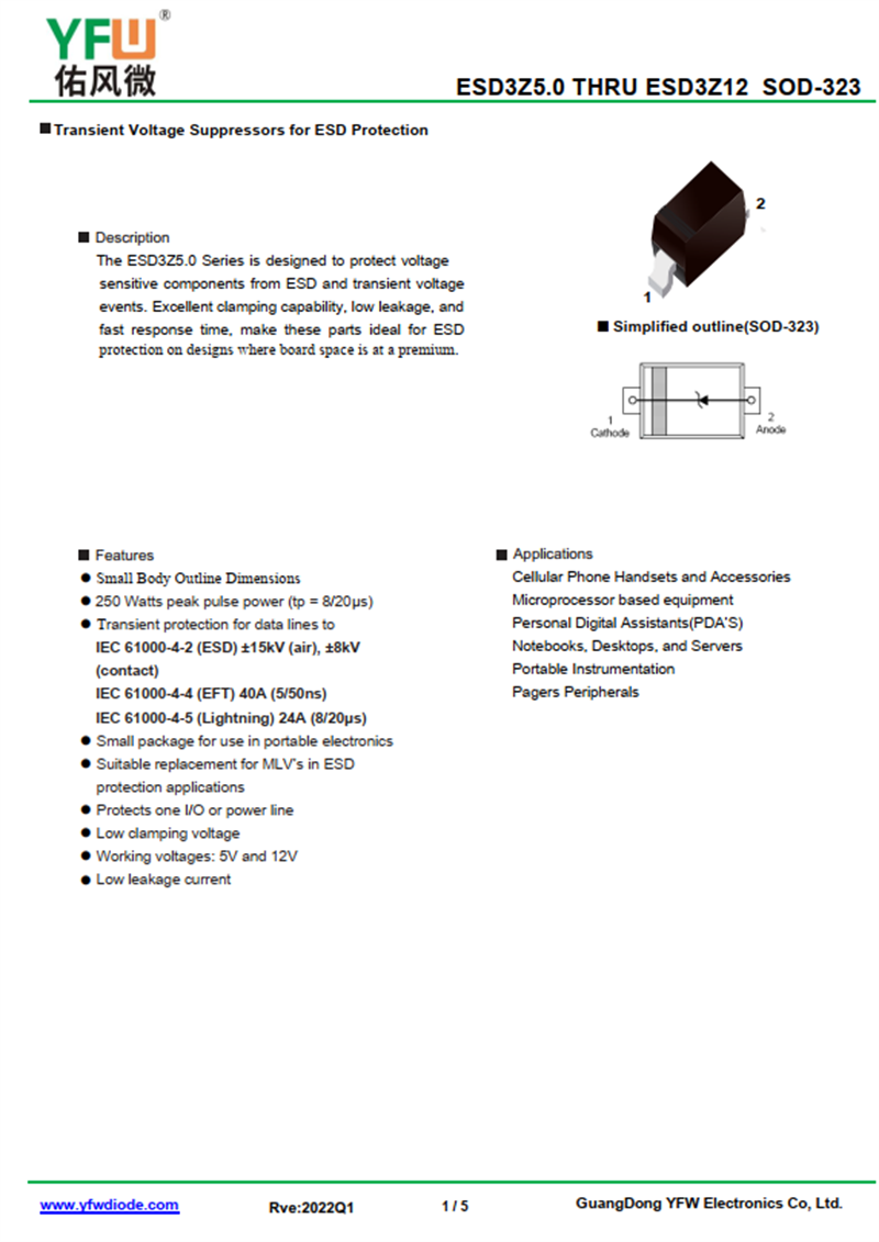 靜電保護二極管ESD3Z5.0 規格書_價格_PDF手冊-廣東佑風微原廠ESD3Z5.0 SOD-323_(YFW佑風微)品牌