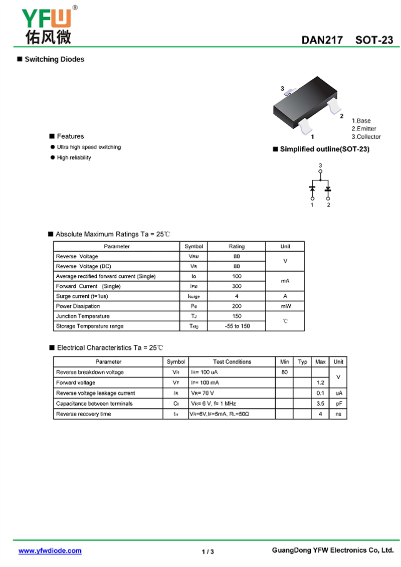 開關二極管DAN217 規格書_價格_PDF手冊-廣東佑風微原廠DAN217 SOT-23_(YFW佑風微)品牌