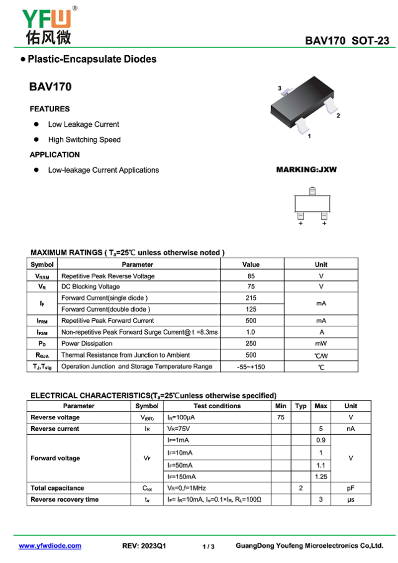 開關二極管BAV170 規格書_價格_PDF手冊-廣東佑風微原廠BAV170 SOT-23_(YFW佑風微)品牌