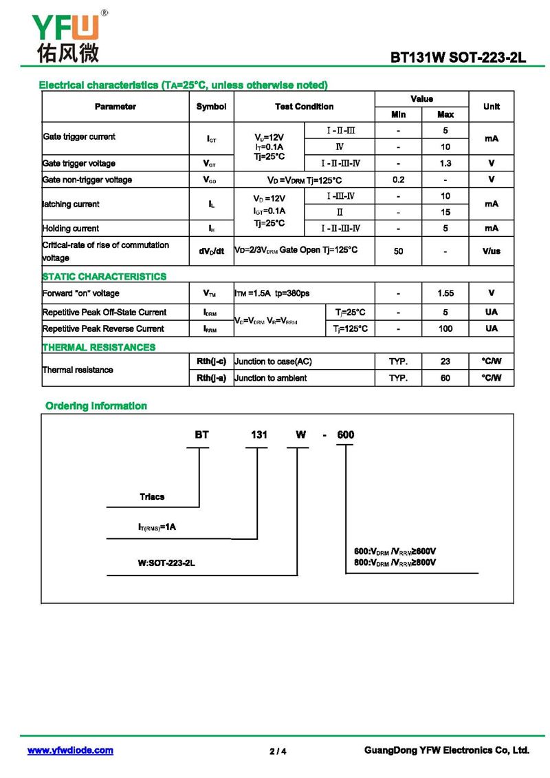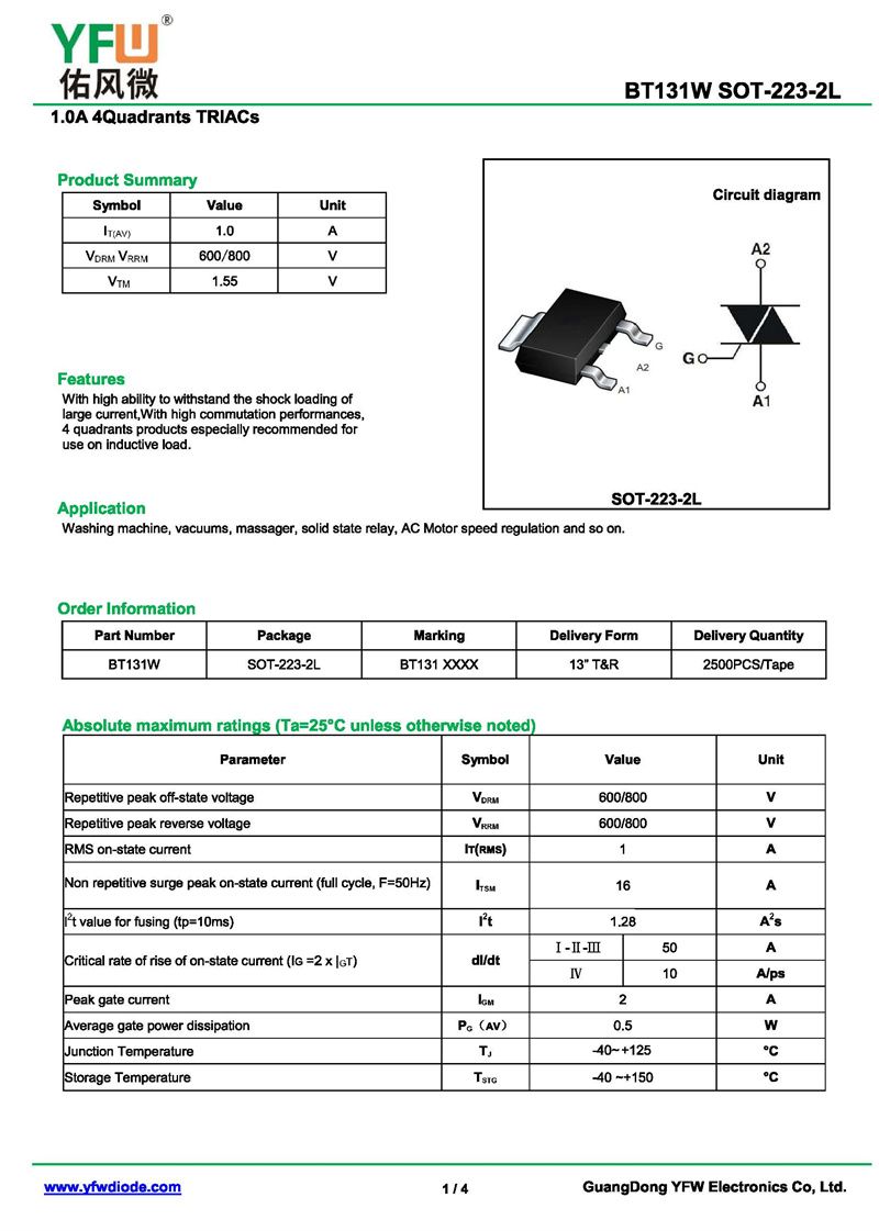 可控硅BT131W-4Q規格書_價格_PDF手冊-廣東佑風微原廠BT131W-4Q SOT-223_(YFW佑風微)品牌