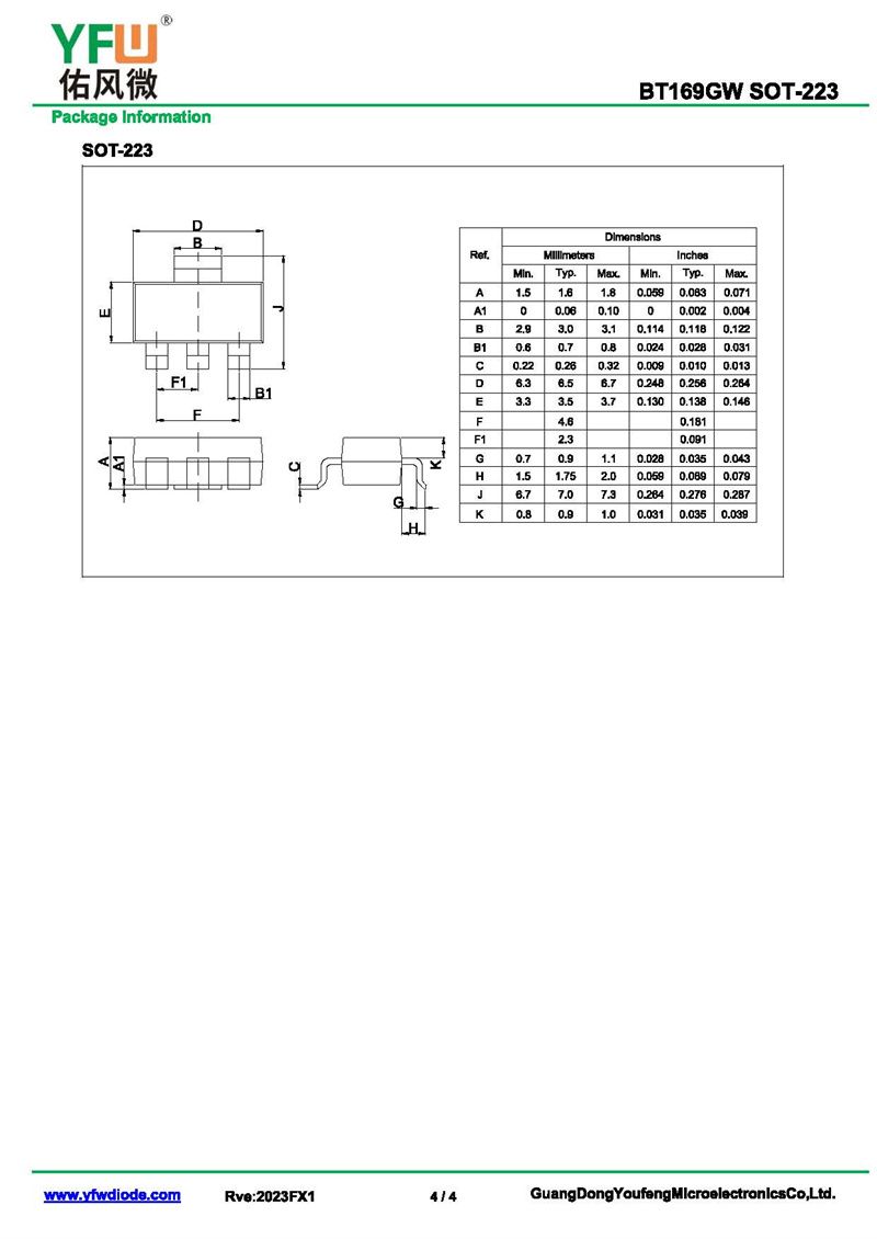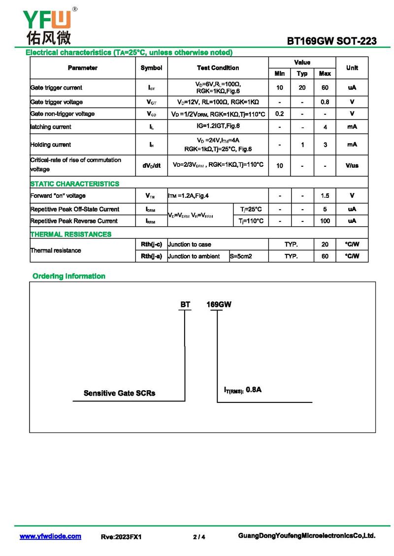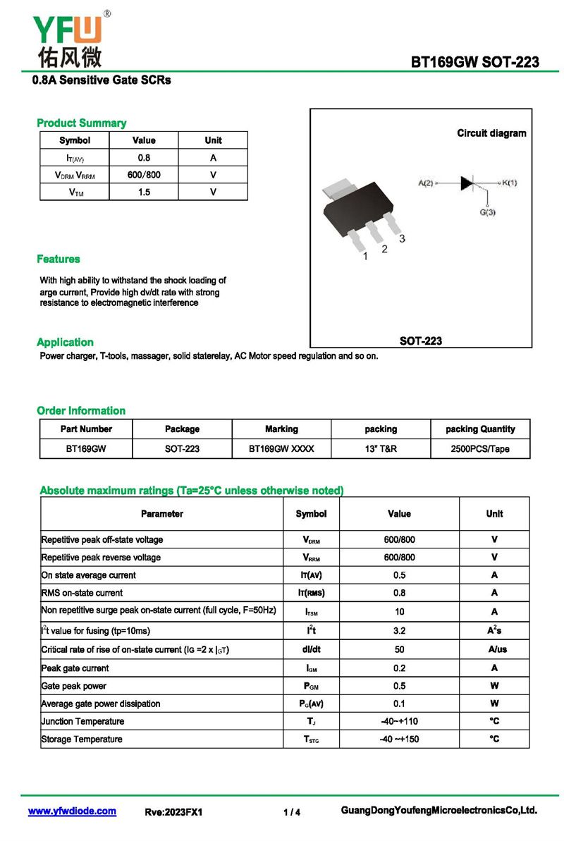 可控硅BT169GW 規格書_價格_PDF手冊-廣東佑風微原廠BT169GW SOT-223_(YFW佑風微)品牌