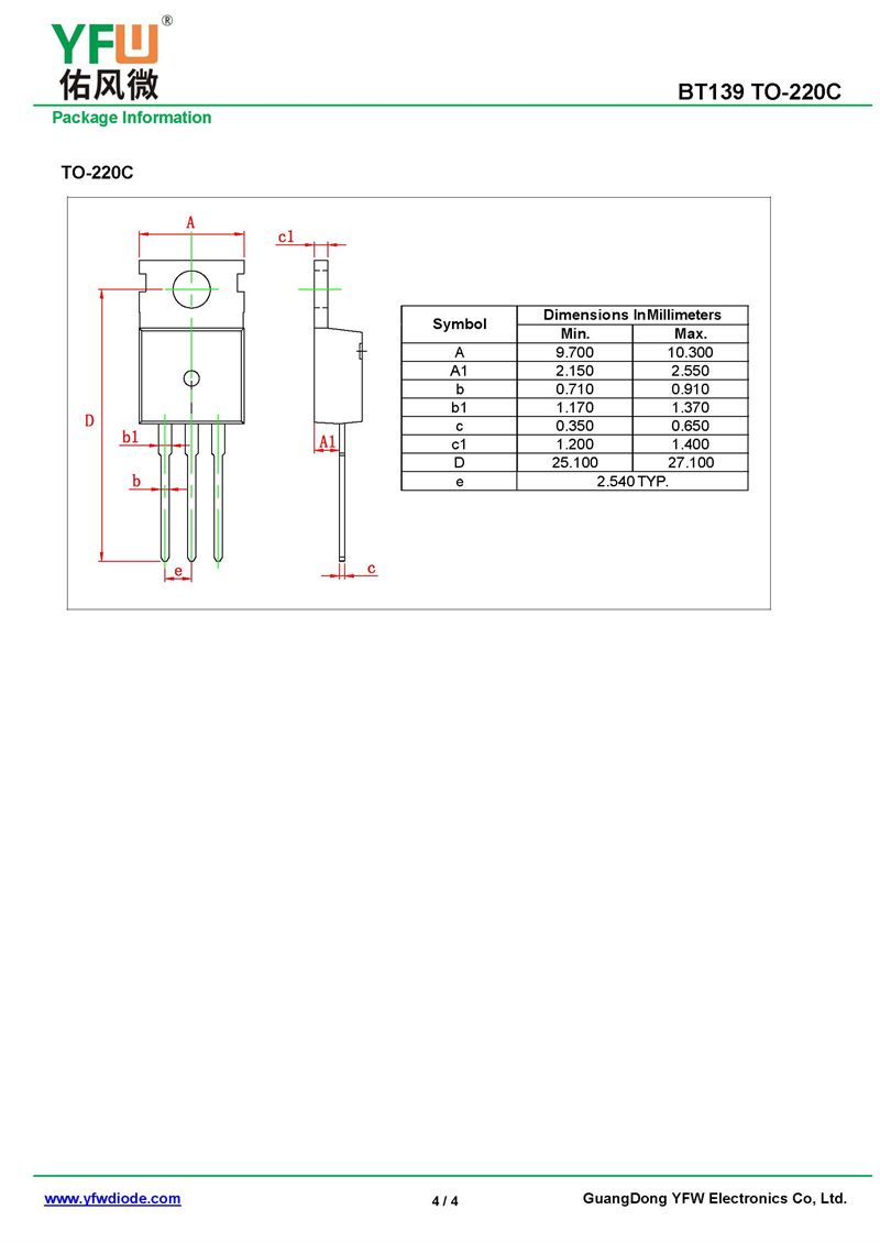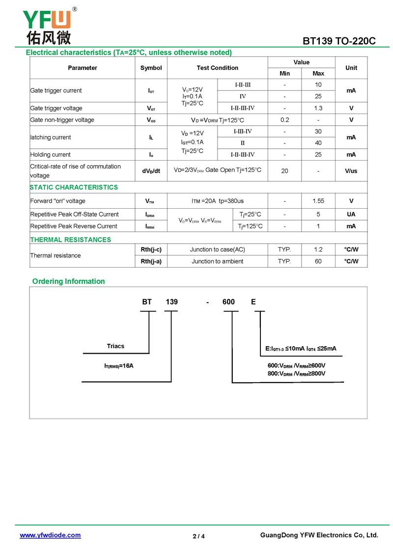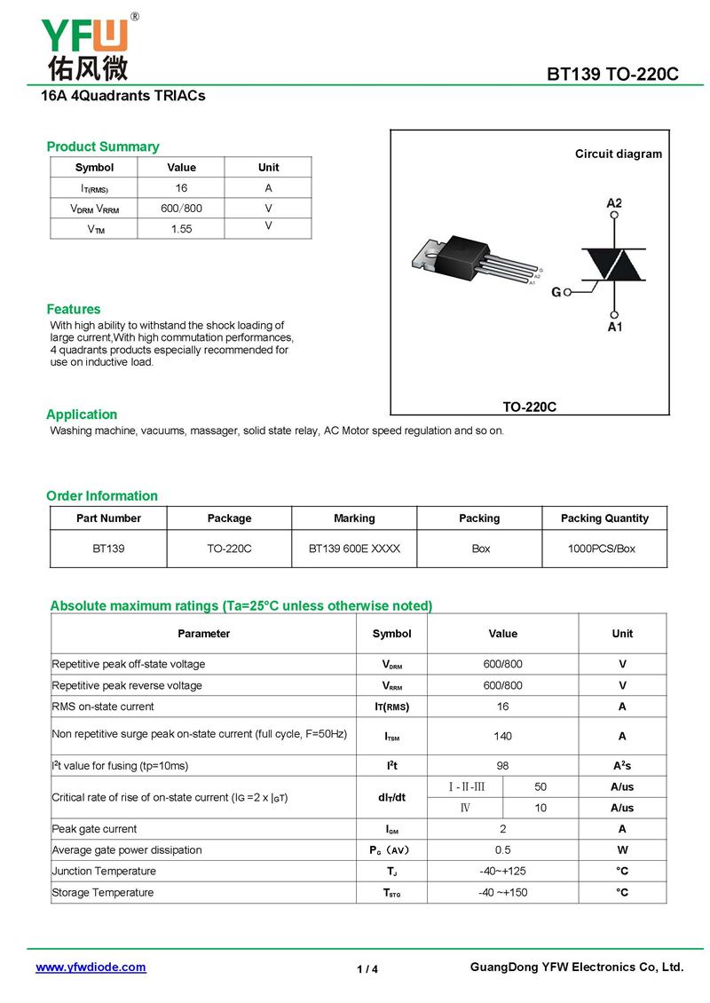 可控硅BT139-4Q 規格書_價格_PDF手冊-廣東佑風微原廠BT139-4Q TO-220C(YFW佑風微)品牌
