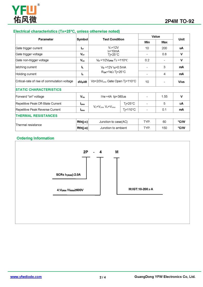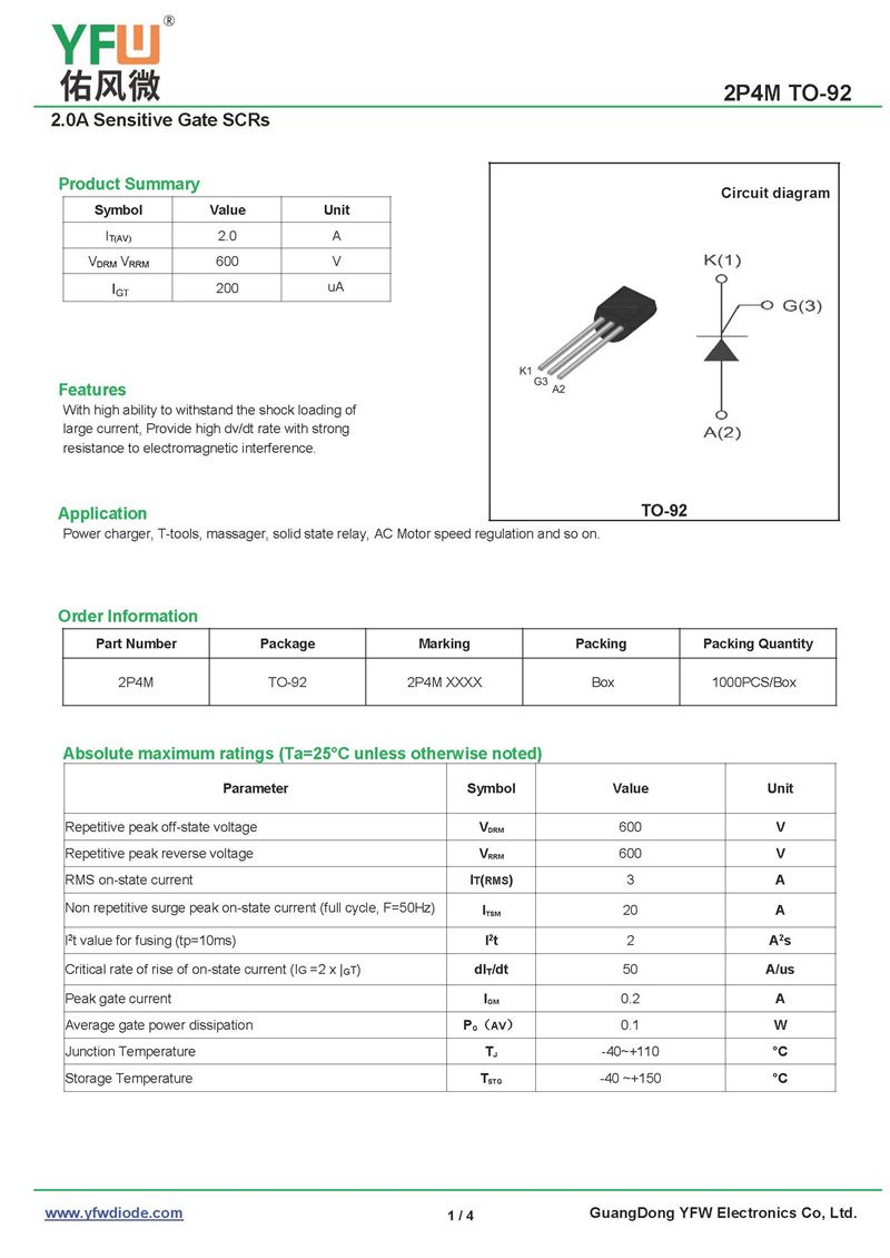可控硅2P4M 規格書_價格_PDF手冊-廣東佑風微原廠2P4M TO-92(YFW佑風微)品牌