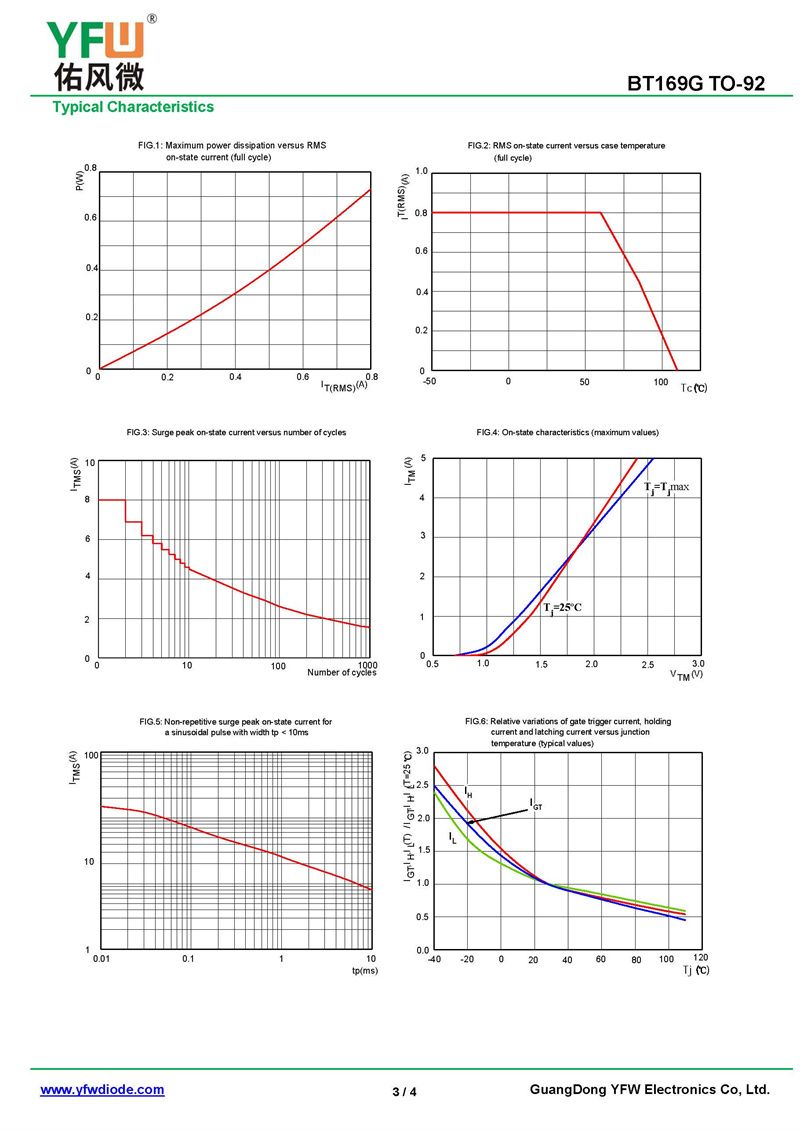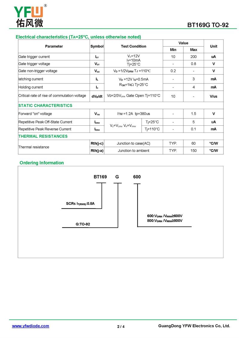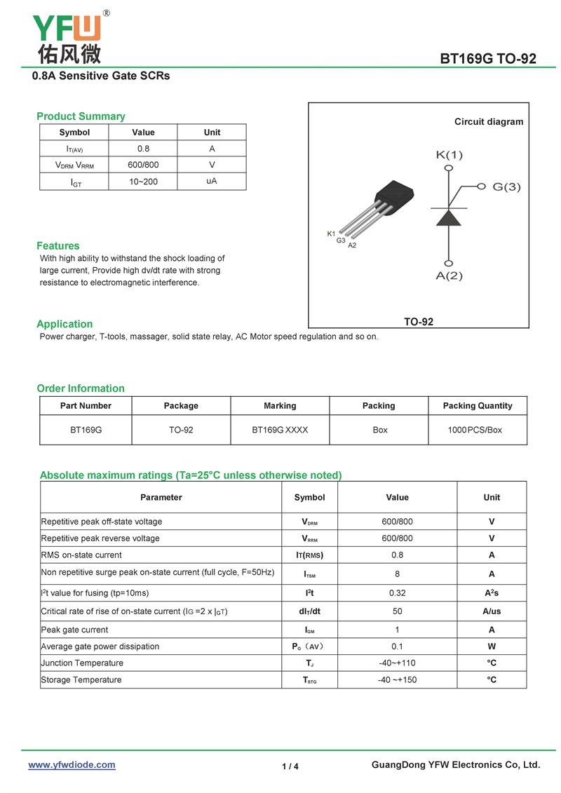 可控硅BT169G 規格書_價格_PDF手冊-廣東佑風微原廠BT169G TO-92(YFW佑風微)品牌
