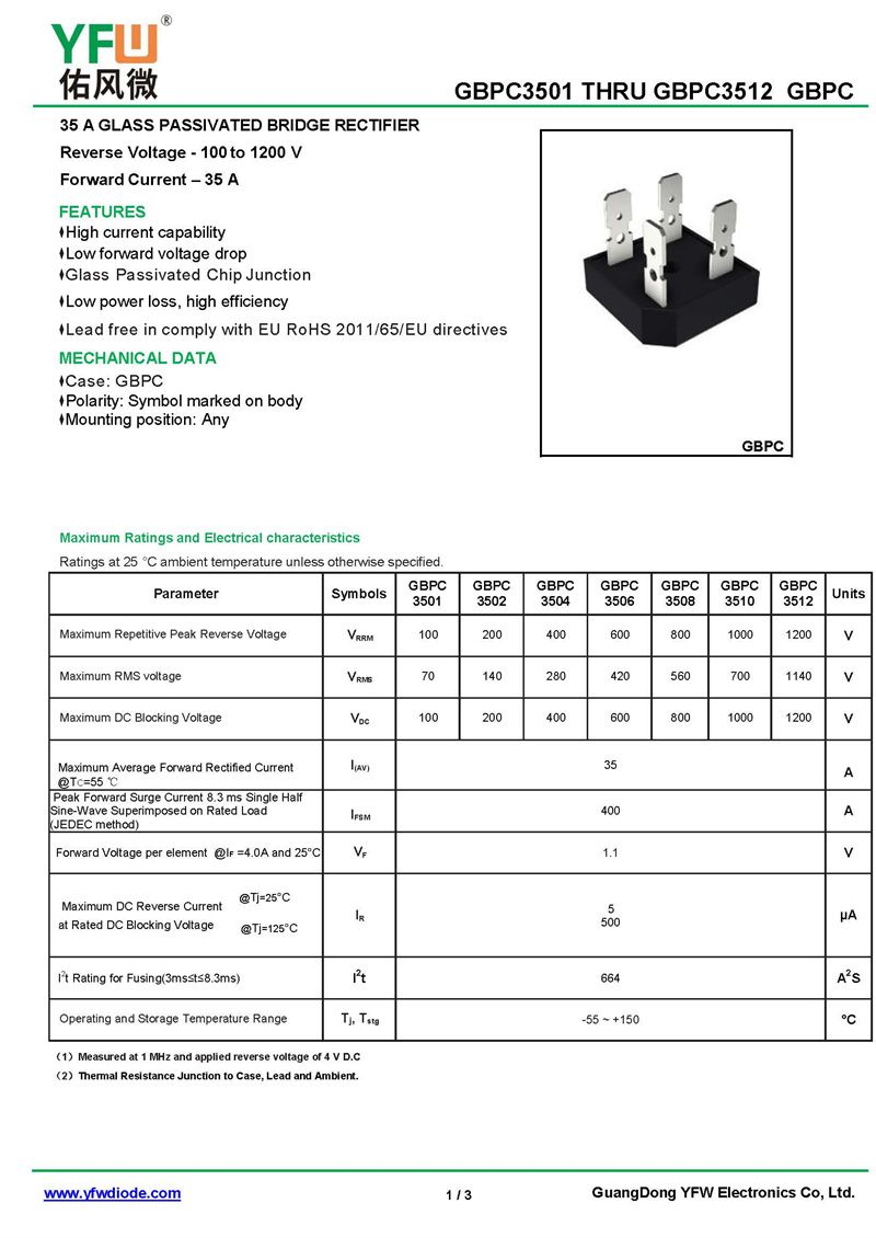 橋式整流器GBPC3510W 規格書_價格_PDF手冊-廣東佑風微原廠GBPC3510W GBPC(YFW佑風微)品牌