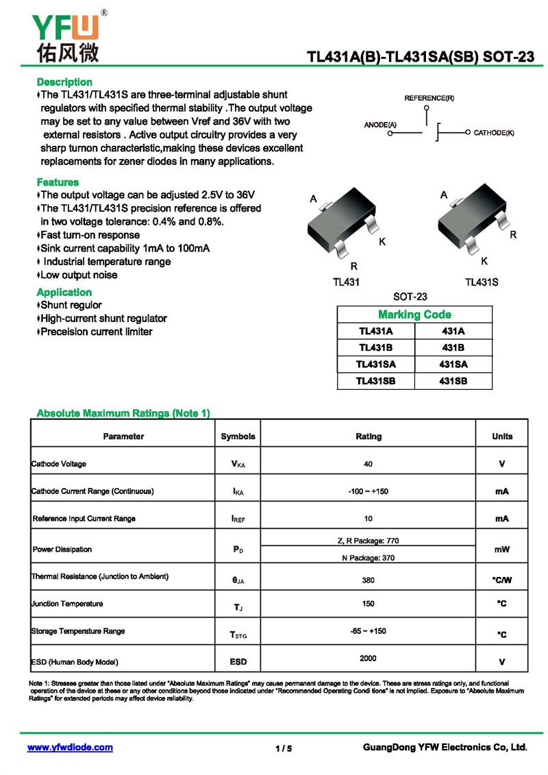 三端穩(wěn)壓管TL431A 規(guī)格書_價格_PDF手冊-廣東佑風(fēng)微原廠TL431A SOT-23(佑風(fēng)微)品牌