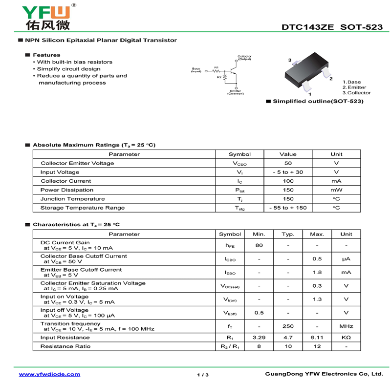 數字晶體管DTC143ZE 規格書_價格_PDF手冊-廣東佑風微原廠DTC143ZE SOT-523(佑風微)品牌