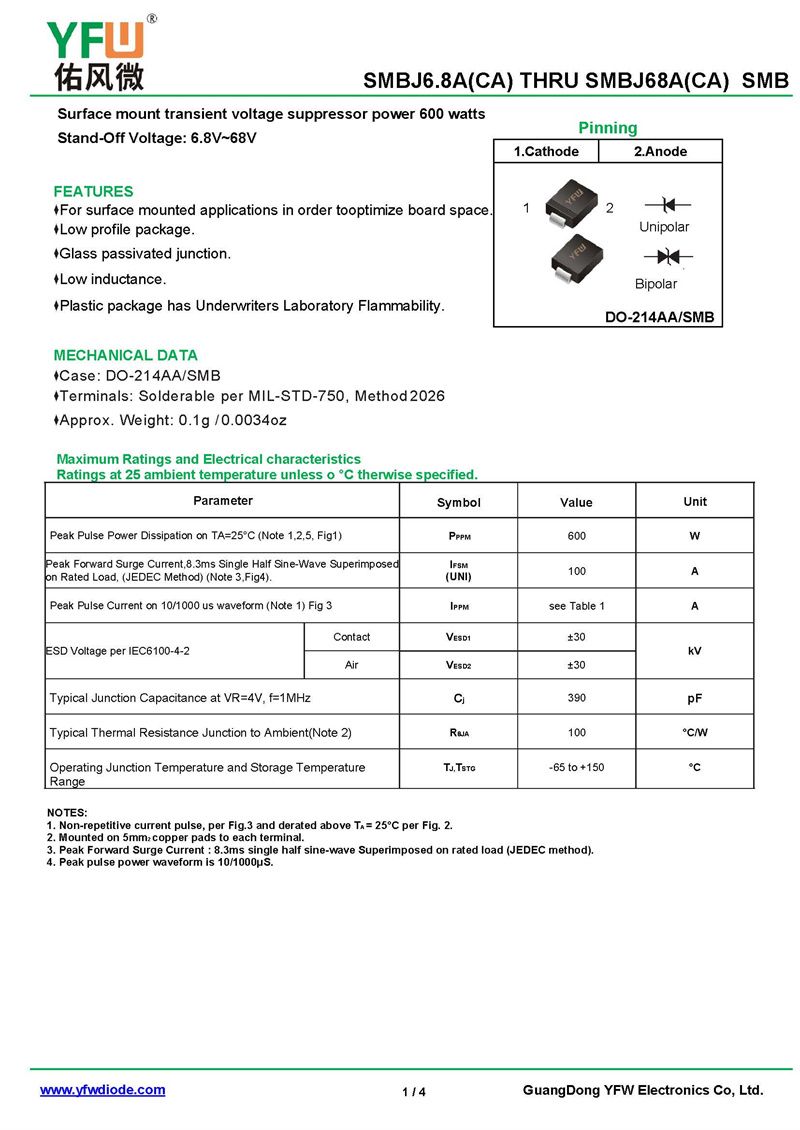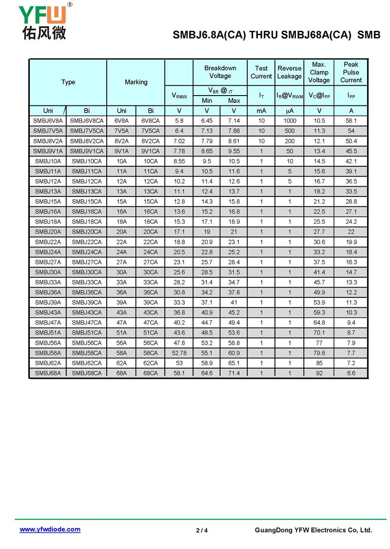 瞬態抑制二極管SMBJ47CA 規格書_價格_PDF手冊-廣東佑風微原廠SMBJ47CA SMB(佑風微)品牌