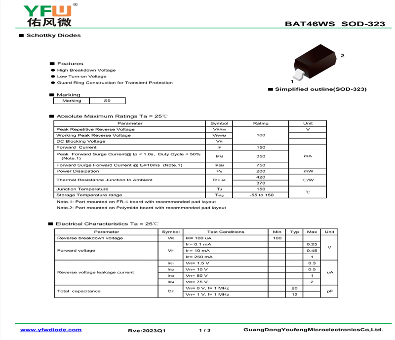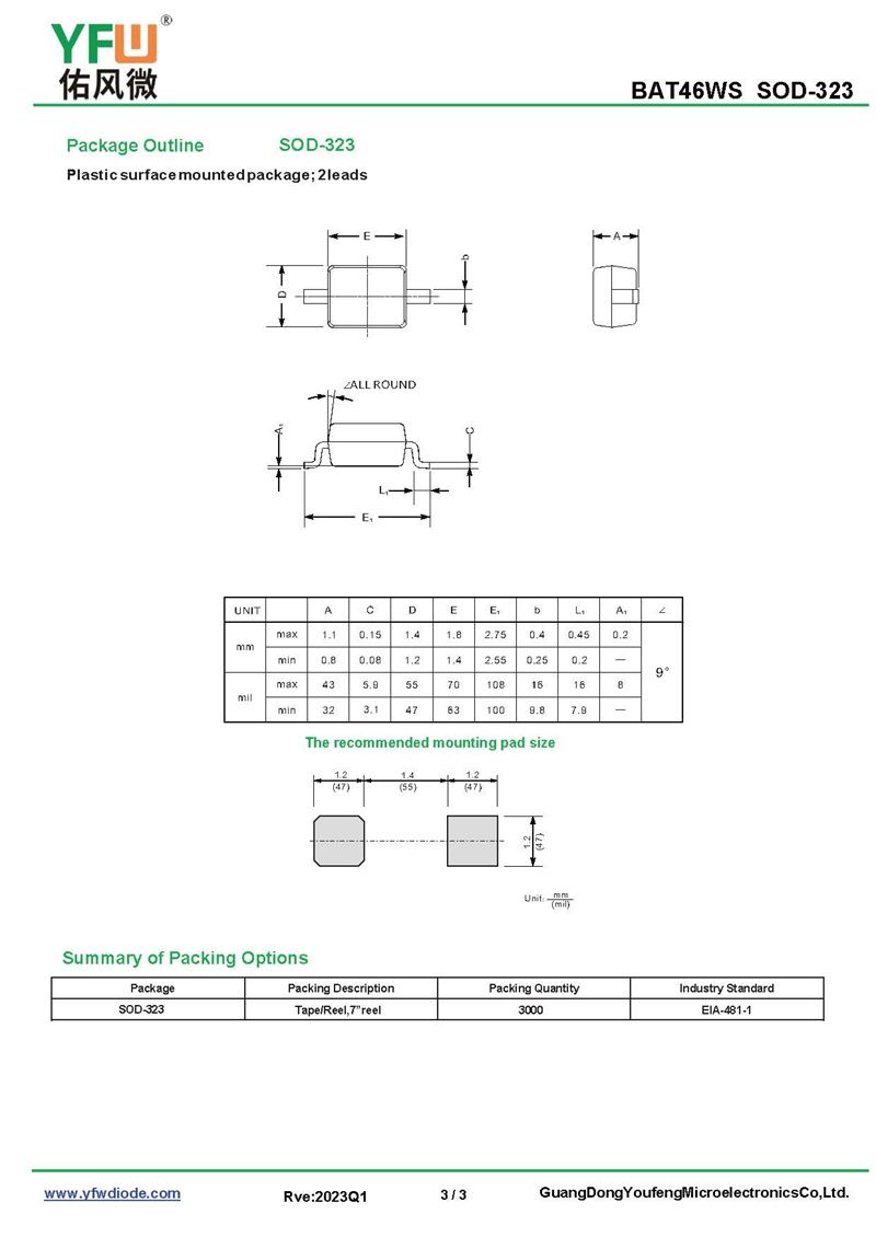 肖特基二極管BAT46WS 規格書_價格_PDF手冊-廣東佑風微原廠BAT46WS SOD-323(佑風微)品牌