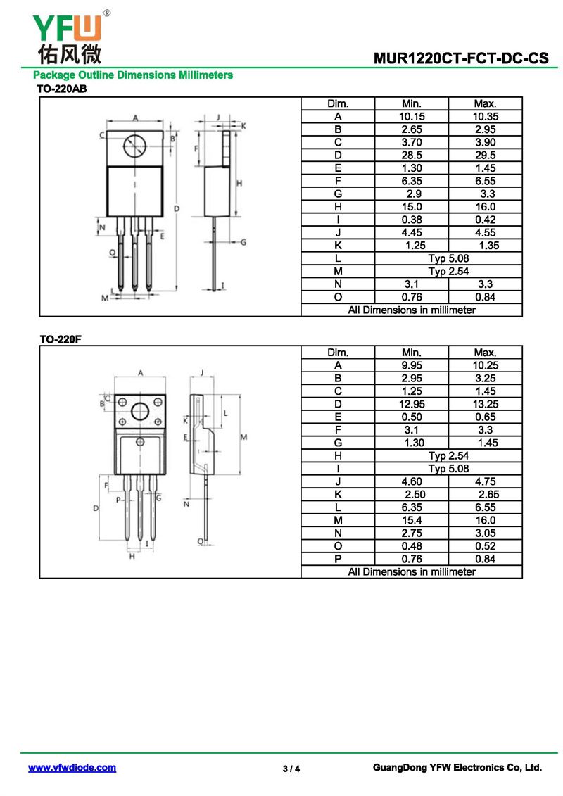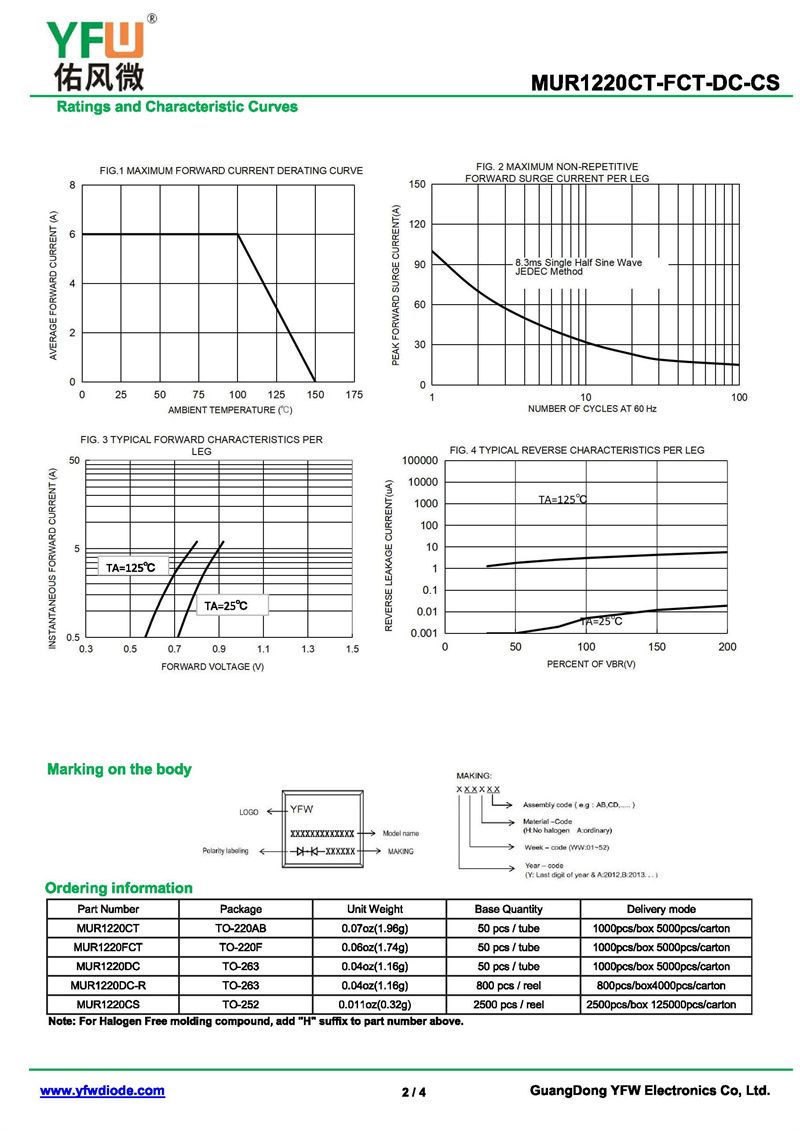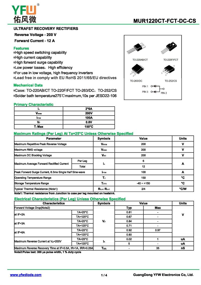 超快恢復二極管MUR1220DC 規格書_價格_PDF手冊-廣東佑風微原廠MUR1220DC TO-263_(YFW佑風微)品牌