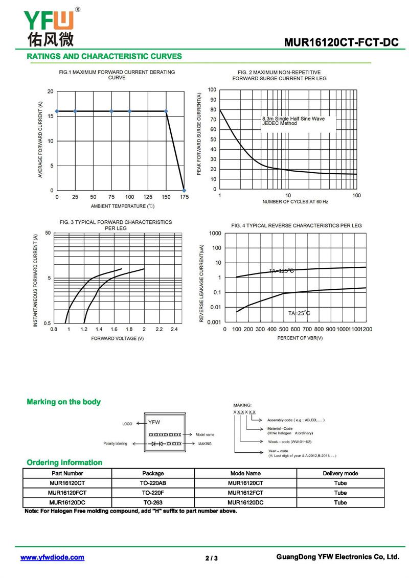 超快恢復二極管MUR16120CT 規格書_價格_PDF手冊-廣東佑風微原廠MUR16120CT TO-220AB_(YFW佑風微)品牌