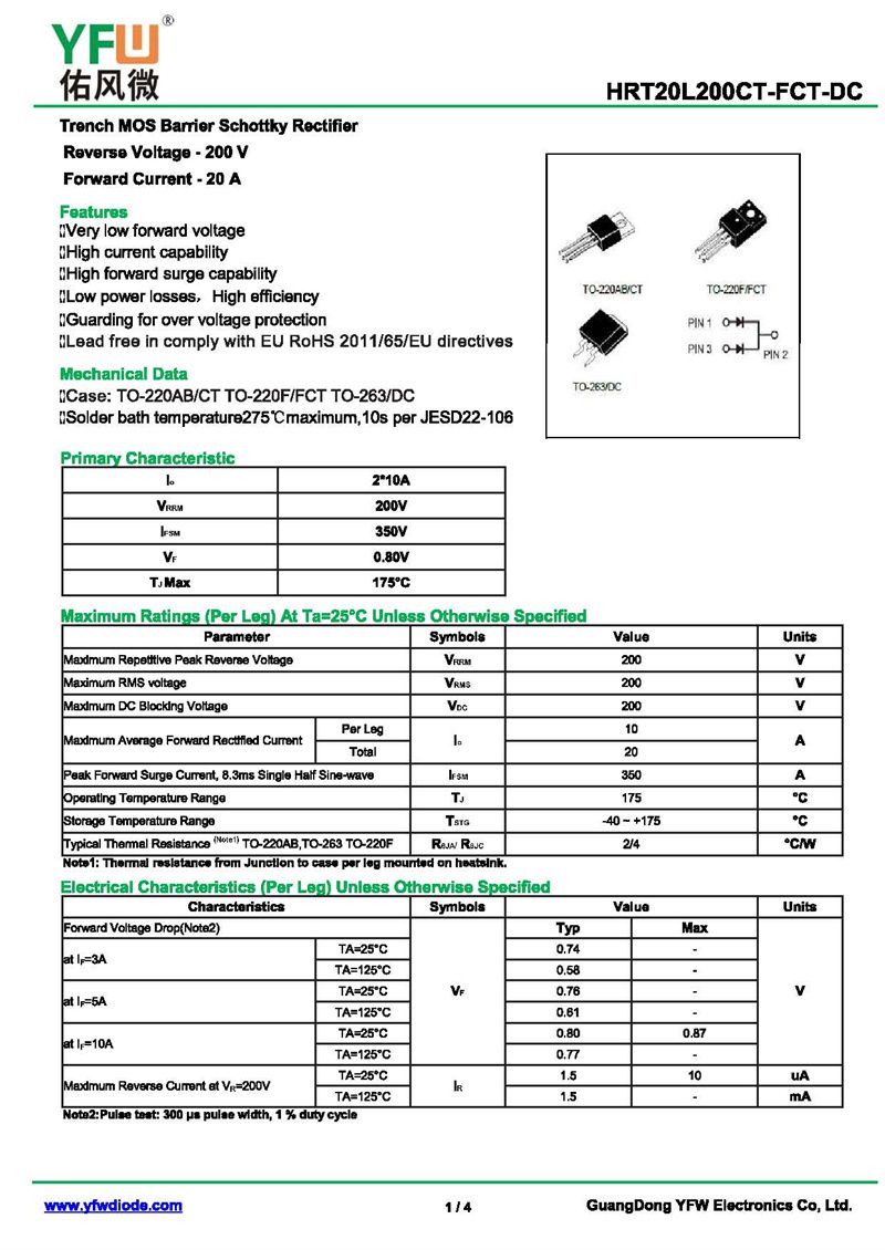 低正向肖特基二極管HRT20L200CT 規(guī)格書_價(jià)格_PDF手冊(cè)-廣東佑風(fēng)微原廠HRT20L200CT TO-220AB_(YFW佑風(fēng)微)品牌