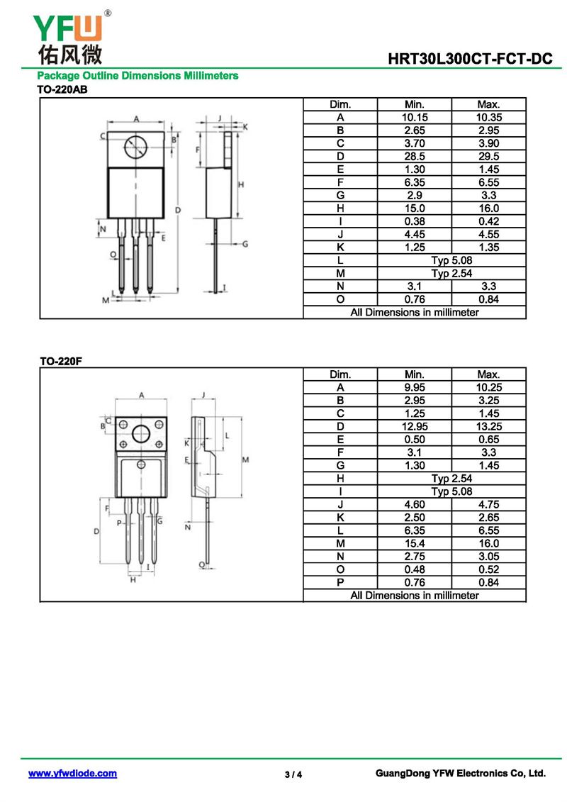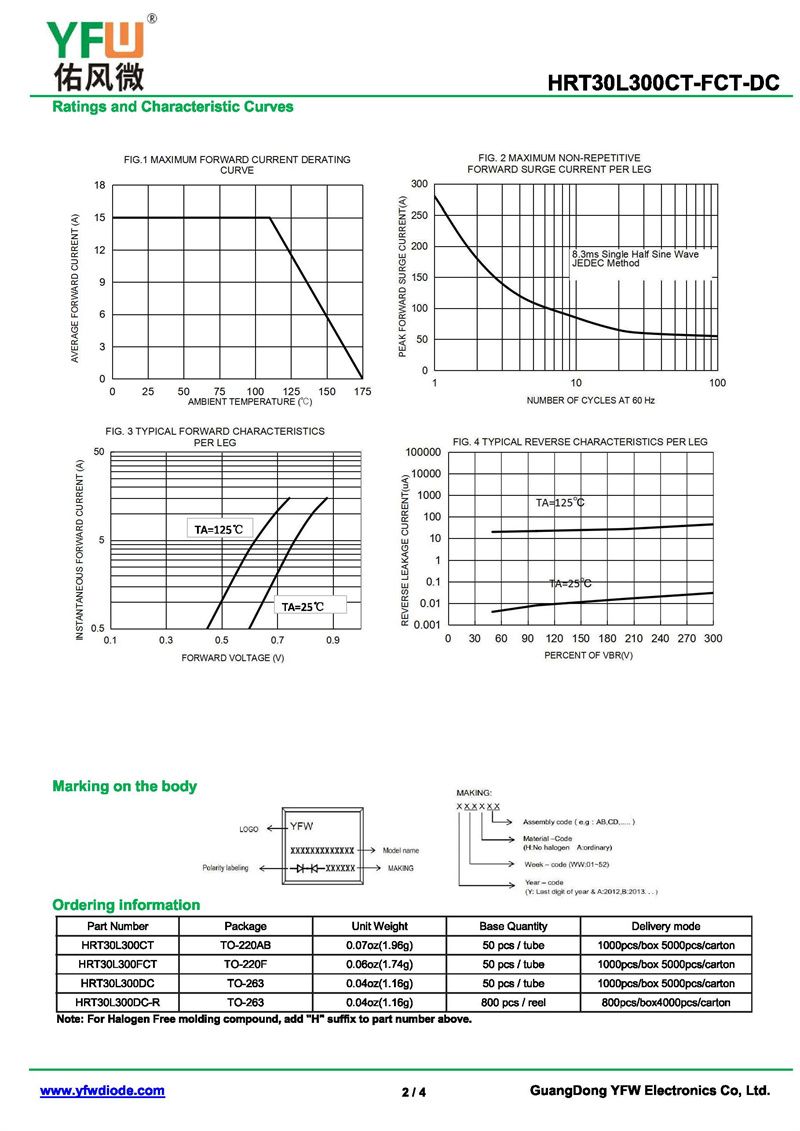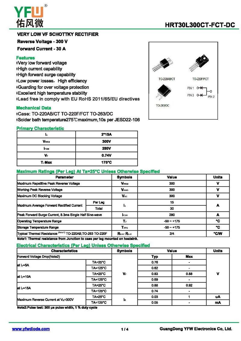 低正向肖特基二極管HRT30L300CT 規格書_價格_PDF手冊-廣東佑風微原廠HRT30L300CT TO-220AB_(YFW佑風微)品牌