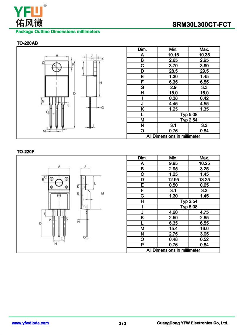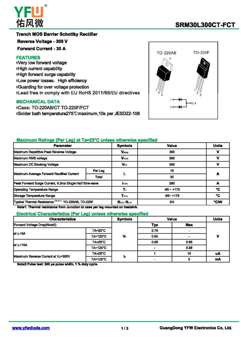 低正向肖特基二極管SRM30L300CT 規(guī)格書_價格_PDF手冊-廣東佑風微原廠SRM30L300CT TO-220AB_(YFW佑風微)品牌