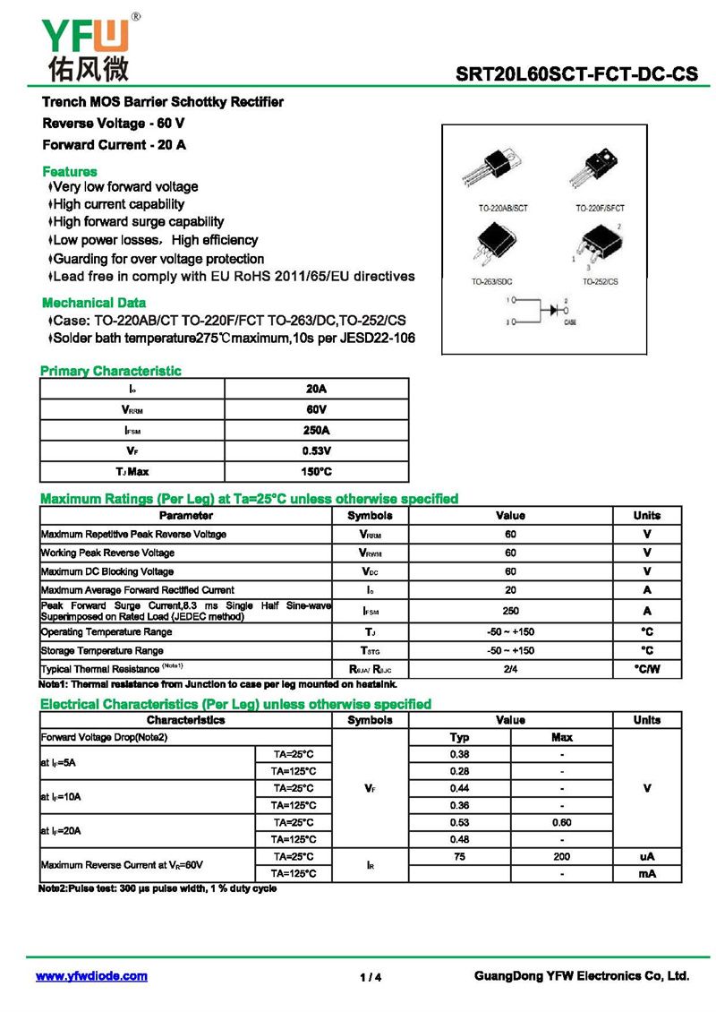 低正向肖特基二極管SRT20L60SCT 規(guī)格書_價(jià)格_PDF手冊(cè)-廣東佑風(fēng)微原廠SRT20L60SCT TO-220AB_(YFW佑風(fēng)微)品牌