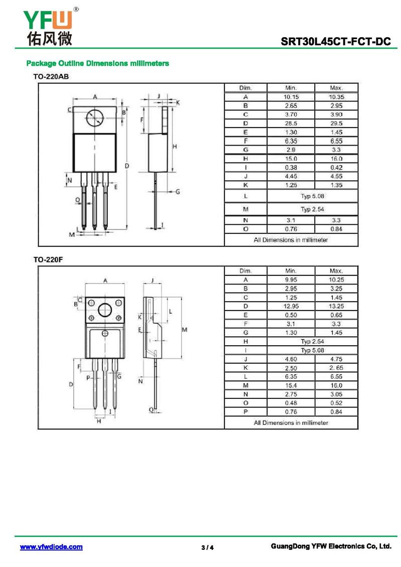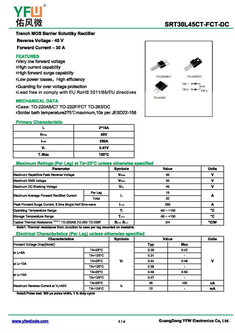 低正向肖特基二極管SRT30L45CT 規格書_價格_PDF手冊-廣東佑風微原廠SRT30L45CT TO-220AB_(YFW佑風微)品牌