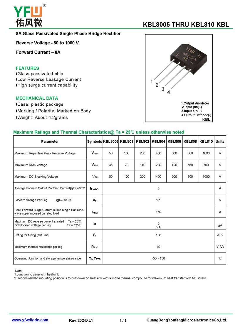 橋式整流器KBL810 規(guī)格書(shū)_價(jià)格_PDF手冊(cè)-廣東佑風(fēng)微原廠KBL810 KBL_(YFW佑風(fēng)微)品牌
