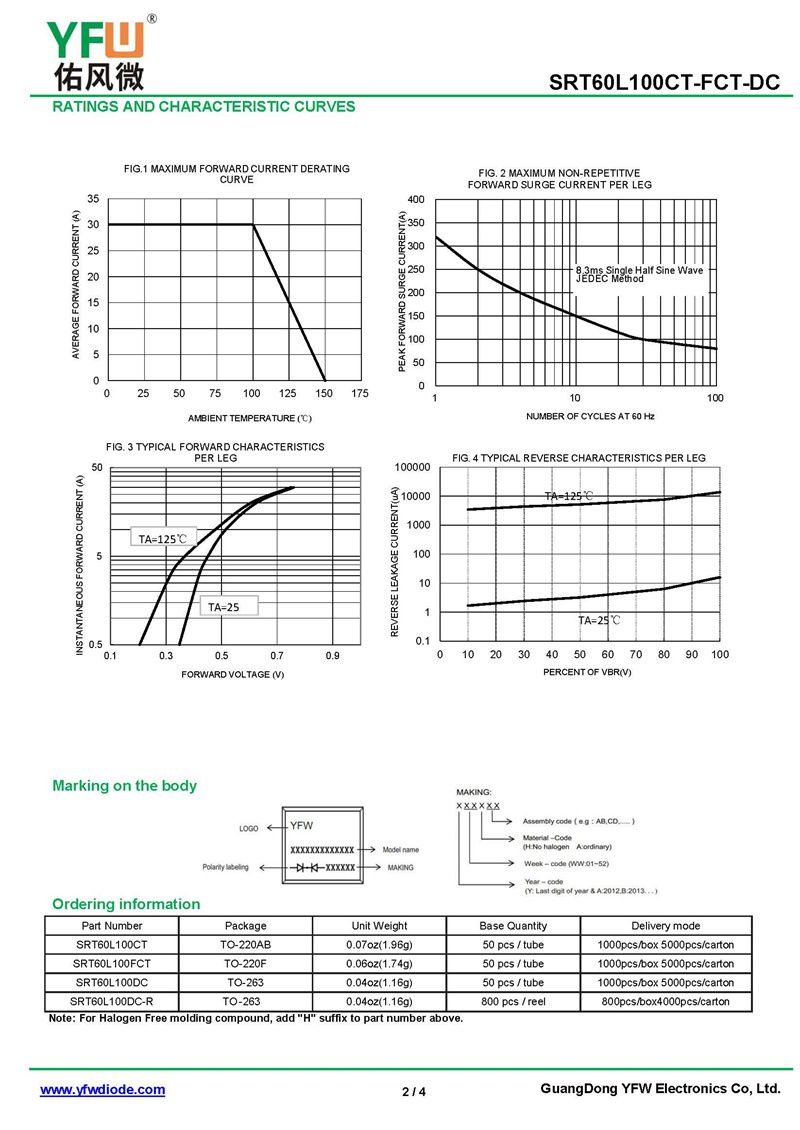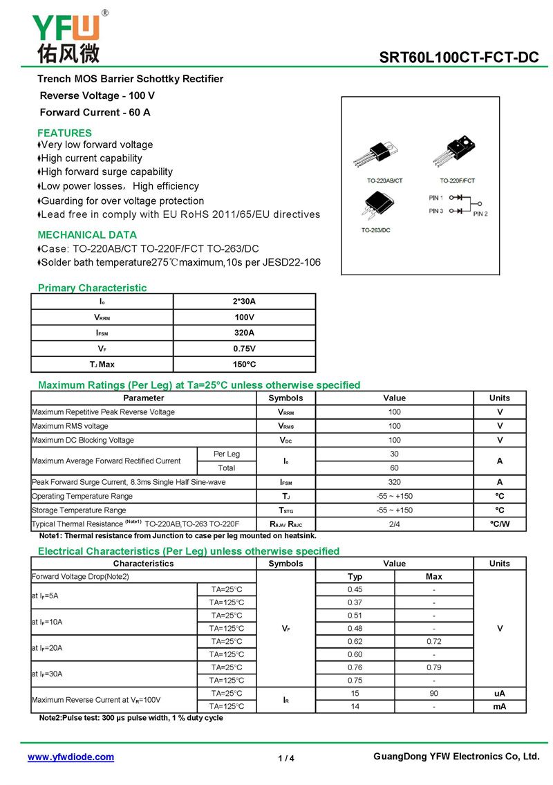 低正向肖特基二極管SRT60L100CT 規(guī)格書(shū)_價(jià)格_PDF手冊(cè)-廣東佑風(fēng)微原廠SRT60L100CT TO-220AB_(YFW佑風(fēng)微)品牌